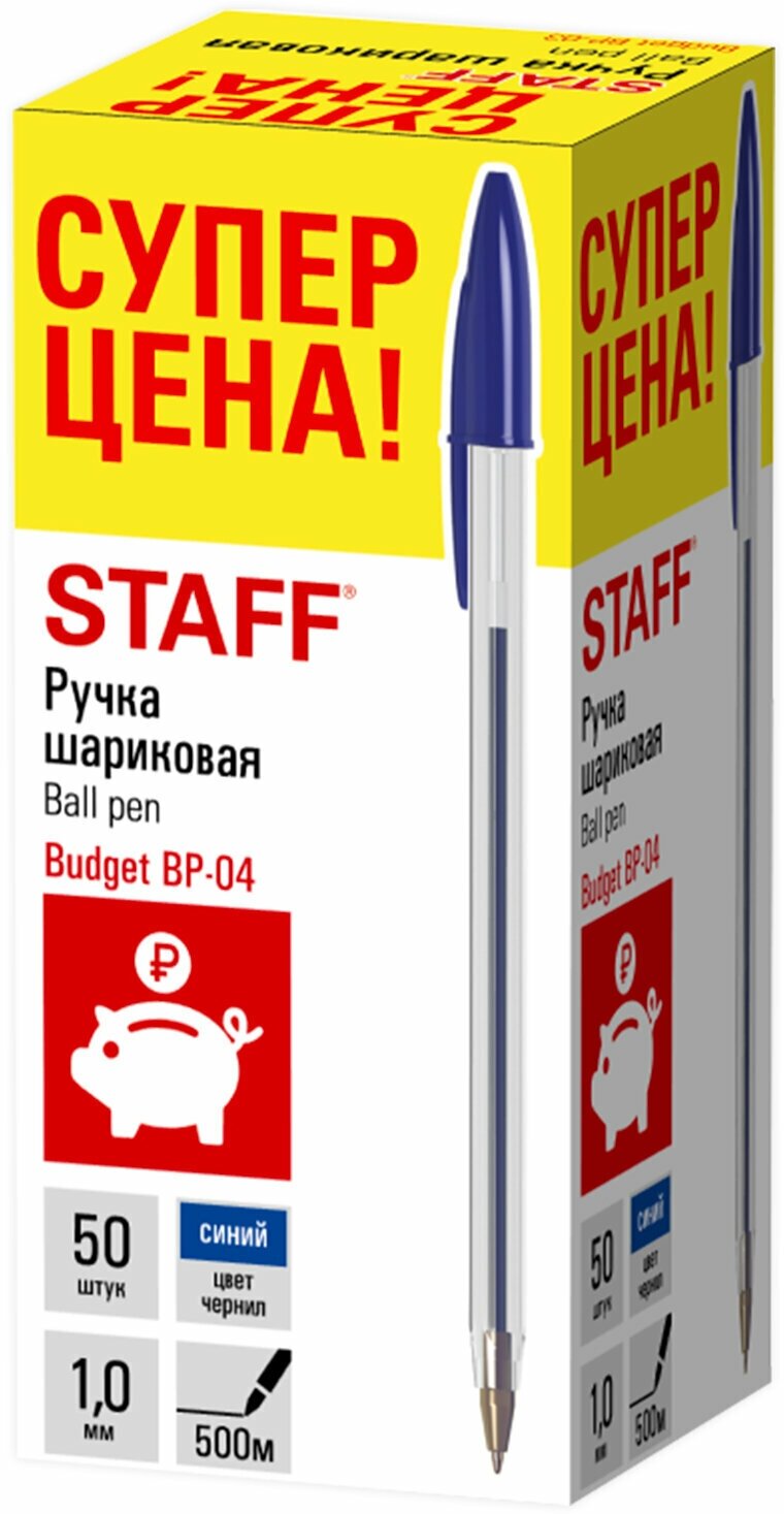 Ручка шариковая синяя STAFF "Basic Budget BP-04", линия письма 0,5 мм, с штрихкодом, упаковка 20 штук интересное: