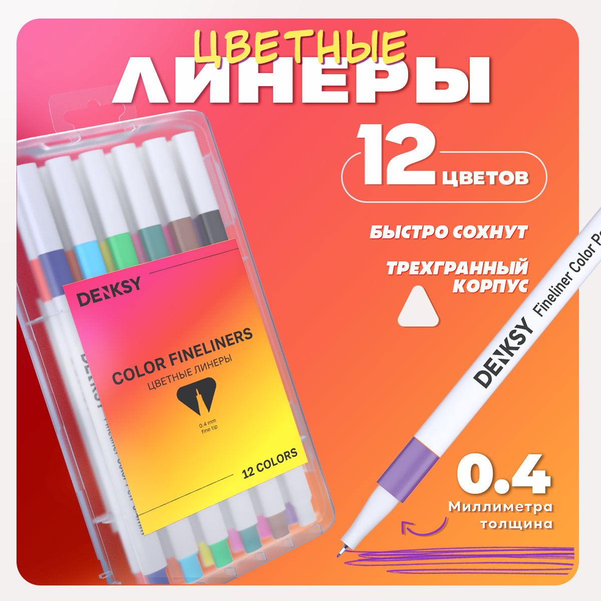 Набор капиллярных ручек DENKSY, 12 ярких цветов, линия 0.4мм