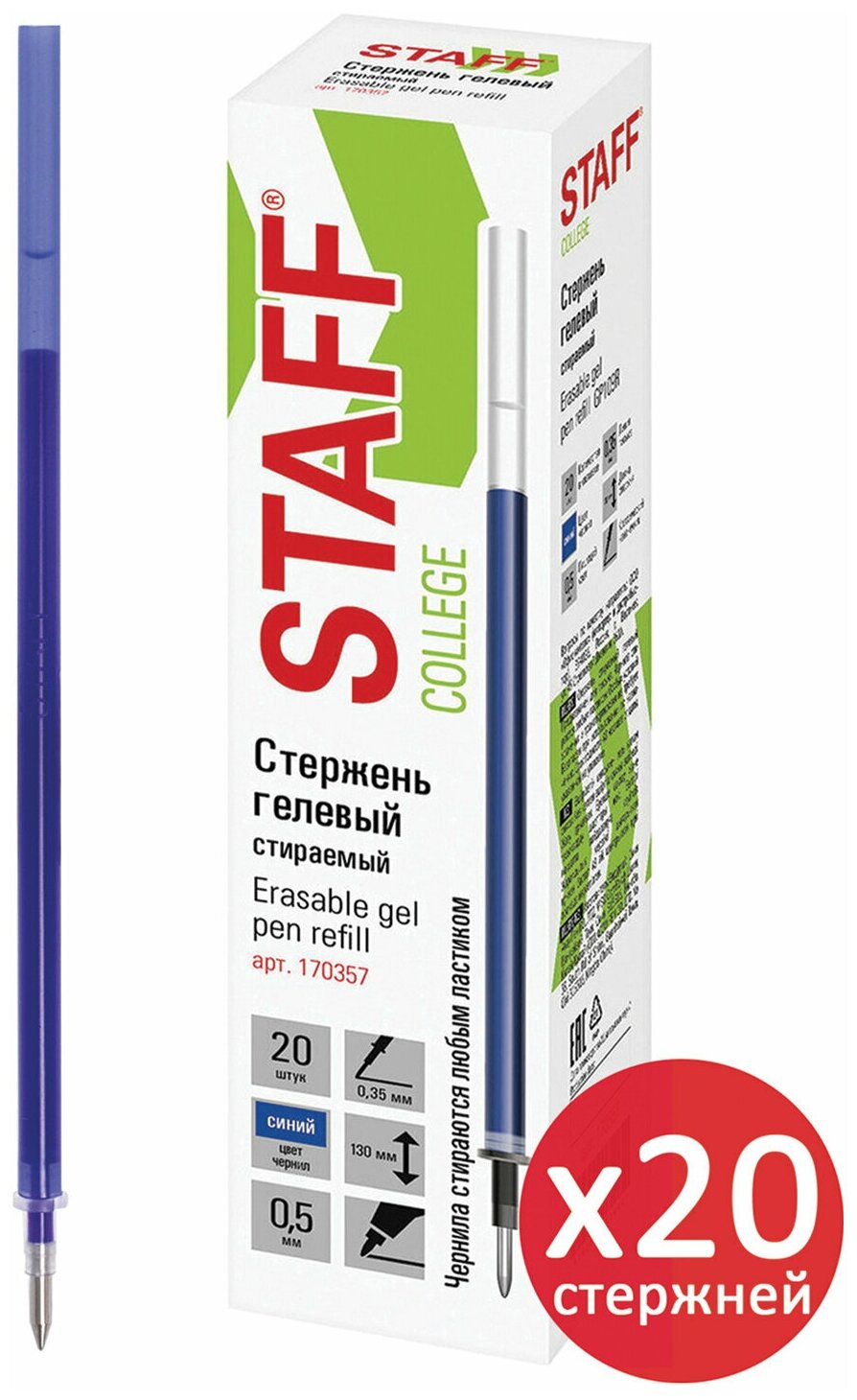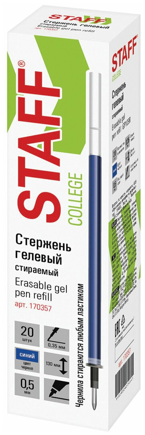 Стержень стираемый гелевый Staff 130 мм, Комплект 20 штук, Синий, узел 0,5 мм, 880230 интересное: