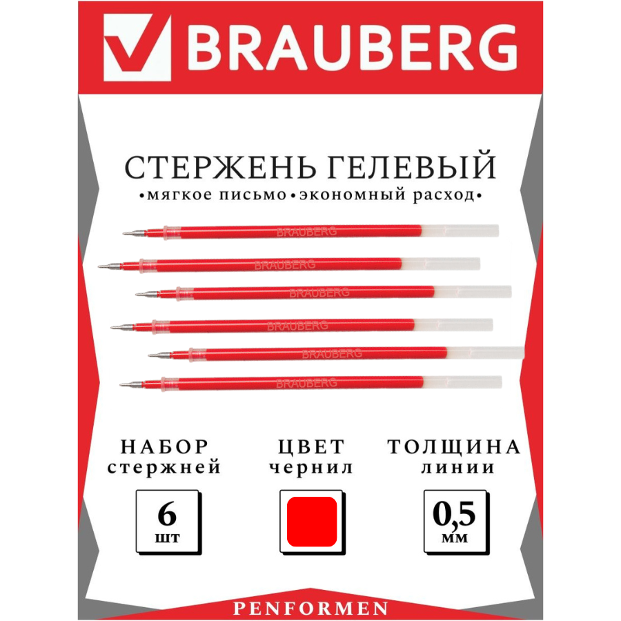 Гелевые стержни BRAUBERG красного цвета, набор из двух штук