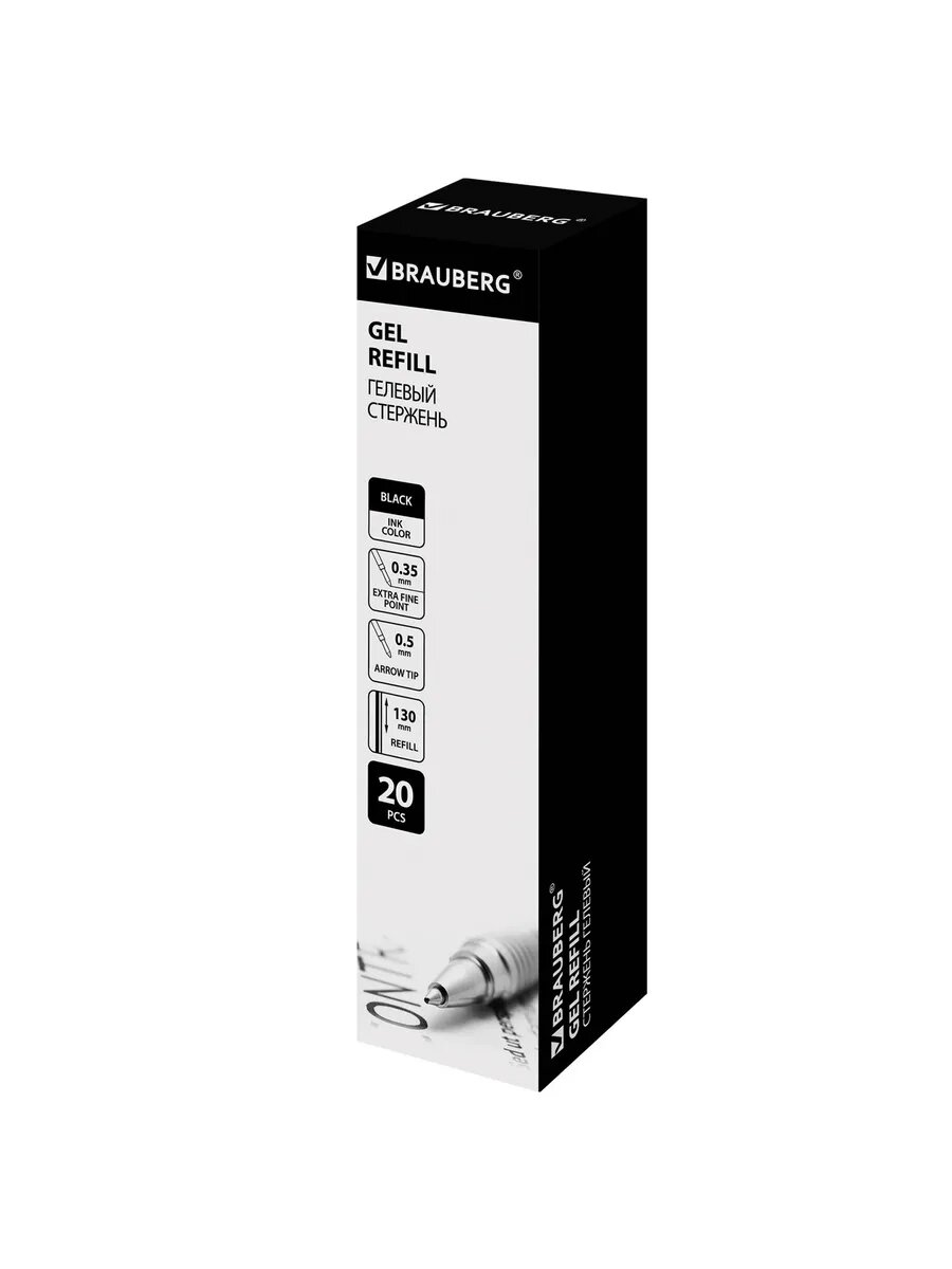 20шт Стержень гелевый BRAUBERG 130 мм, черный, узел 0,5 мм, интересное: