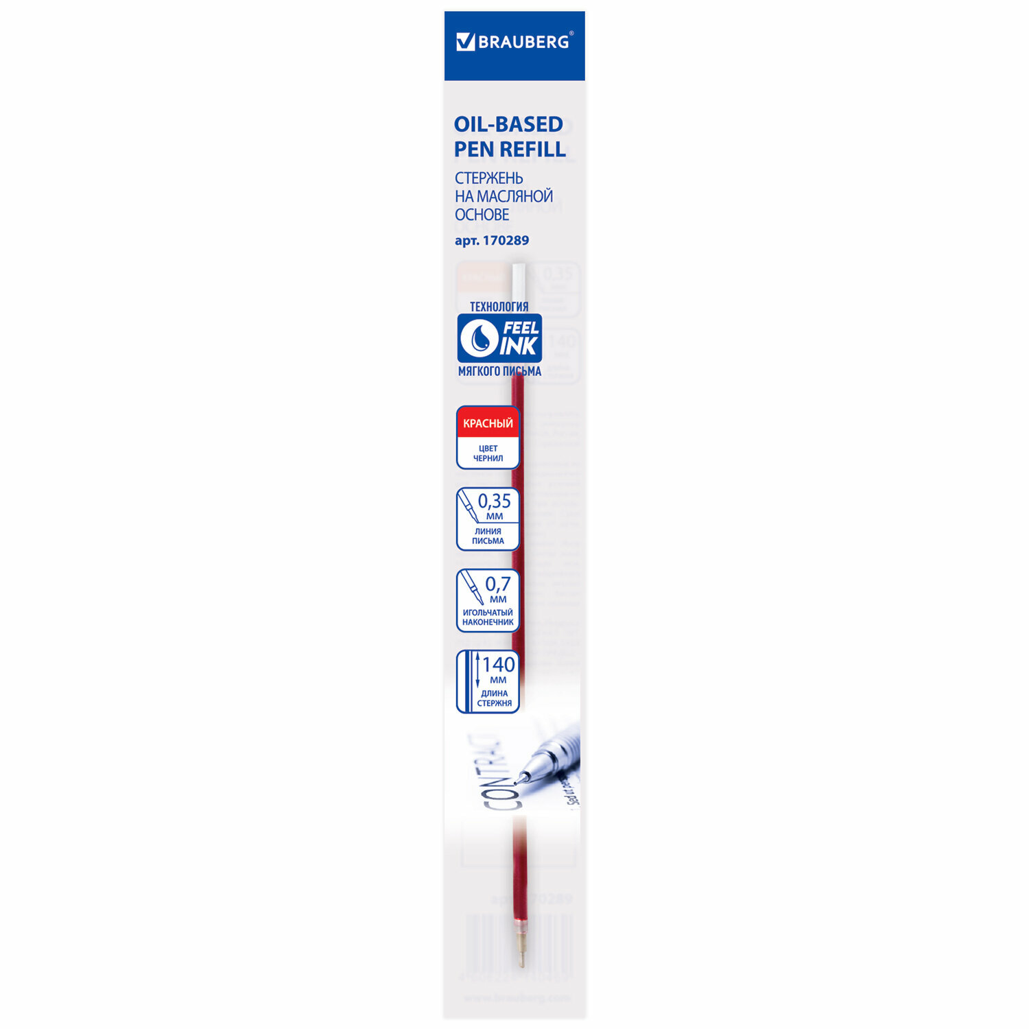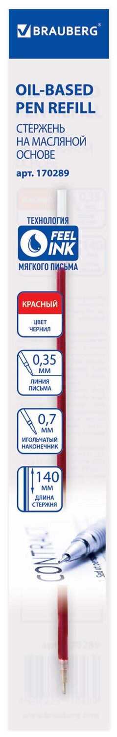 Стержень шариковый масляный BRAUBERG, 140 мм, красный, игольчатый узел 0,7 мм, линия письма 0,35 мм, 170289