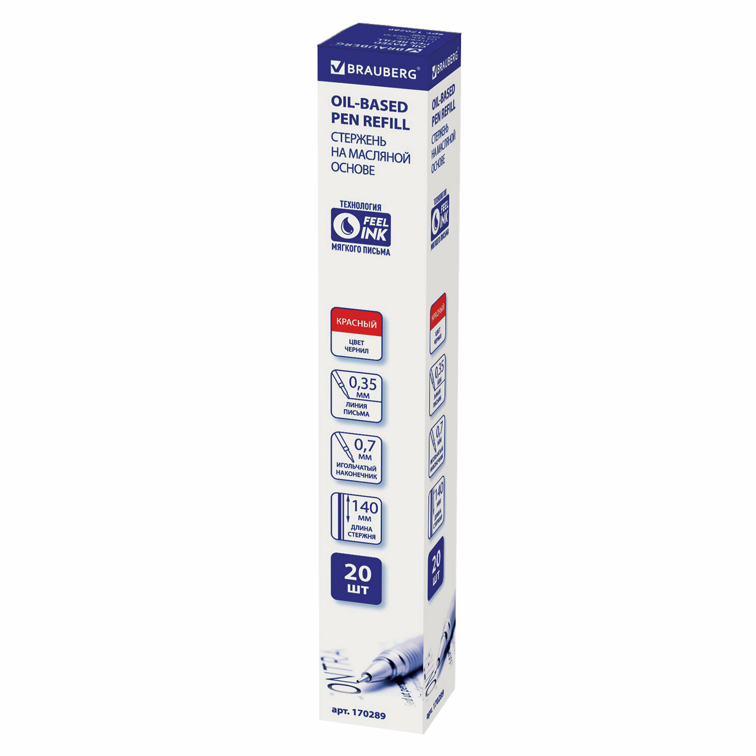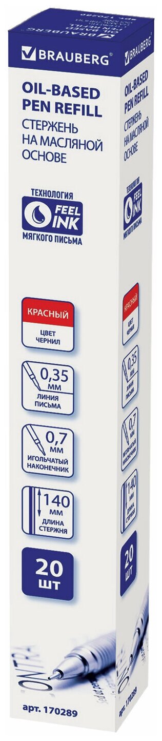 Стержень шариковый масляный BRAUBERG, 140 мм, красный, игольчатый узел 0,7 мм, линия письма 0,35 мм, 170289, 20 штук