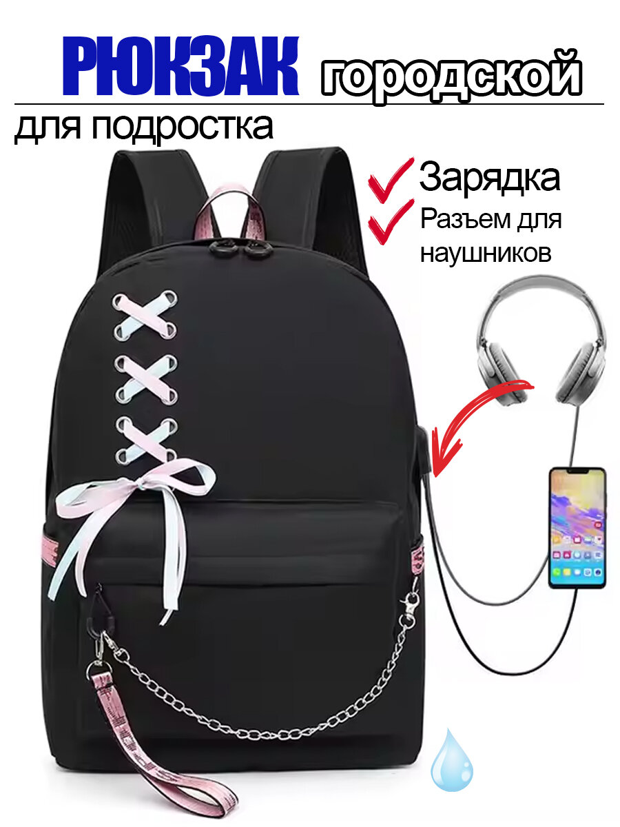 Рюкзак городской и школьный, для девочек подростков, со шнуровкой и цепочкой, с USB портом, интересное: