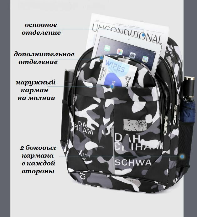 Рюкзак школьный повседневный универсальный камуфляж черный интересное: