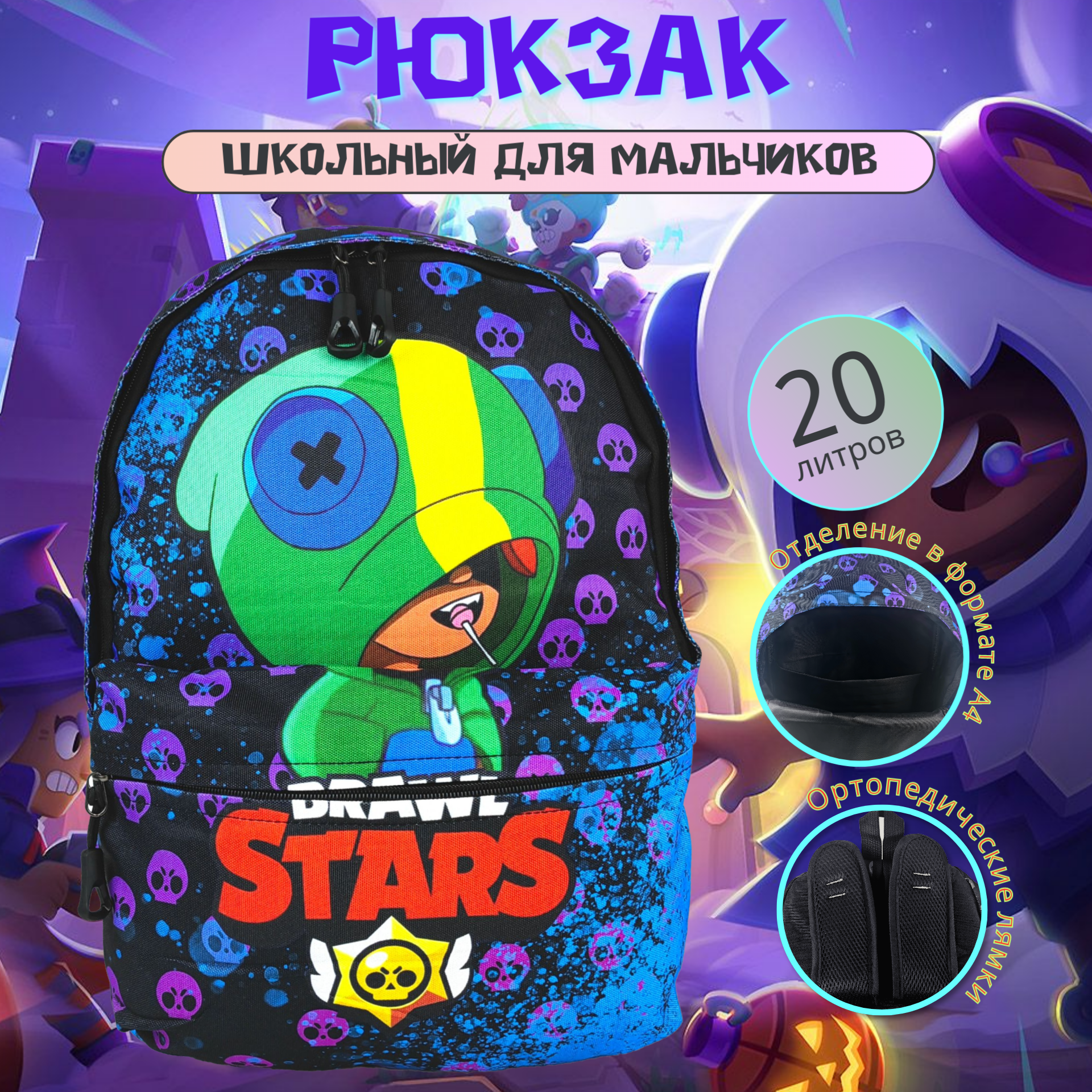 Рюкзак школьный для мальчиков Leon - Brawl Stars, 20л, 38*28*17 см, черно-сиреневый интересное: