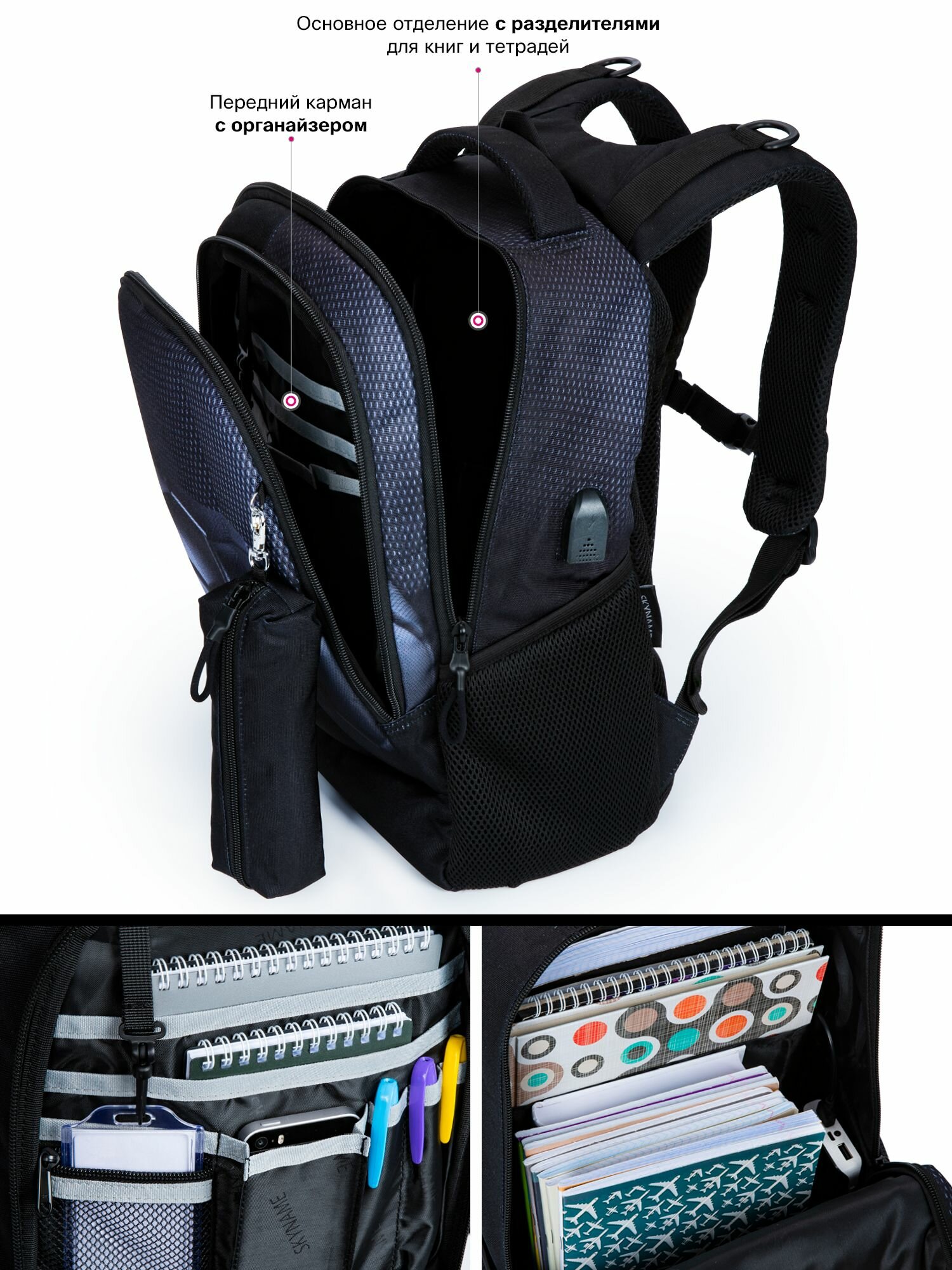 Рюкзак школьный для мальчика подростковый с анатомической спинкой, 17 л, SkyName (СкайНейм), с USB + пенал интересное: