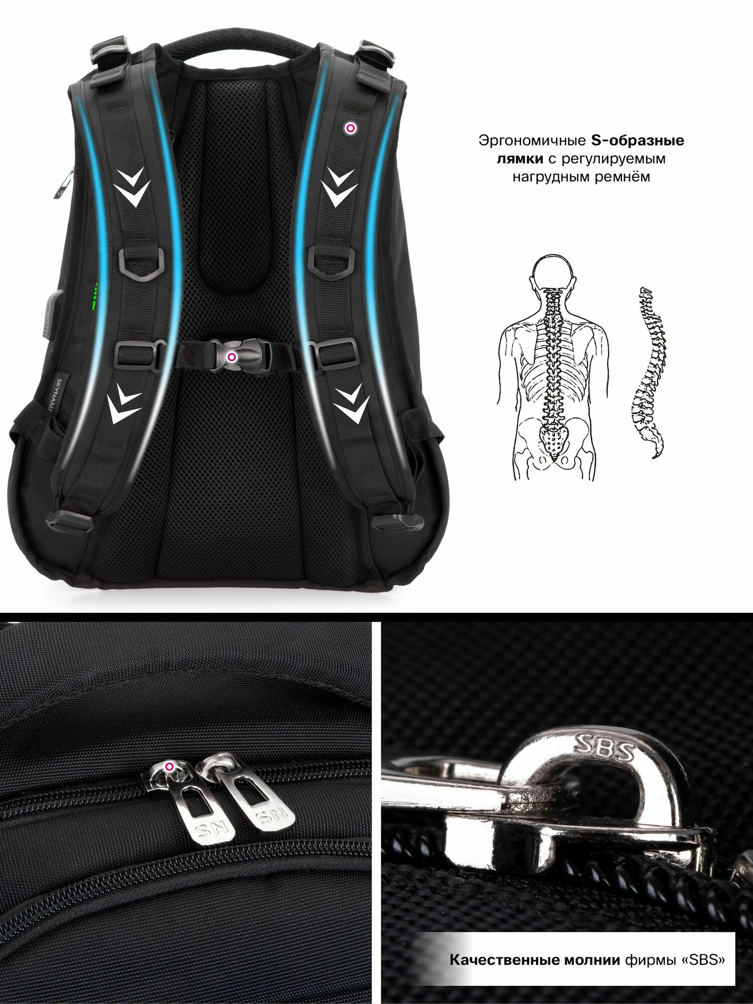 СохранитьРюкзак школьный для мальчика/девочки подростка 21 л А4 черный с анатомической спинкой + USB, SkyName (СкайНейм) интересное: