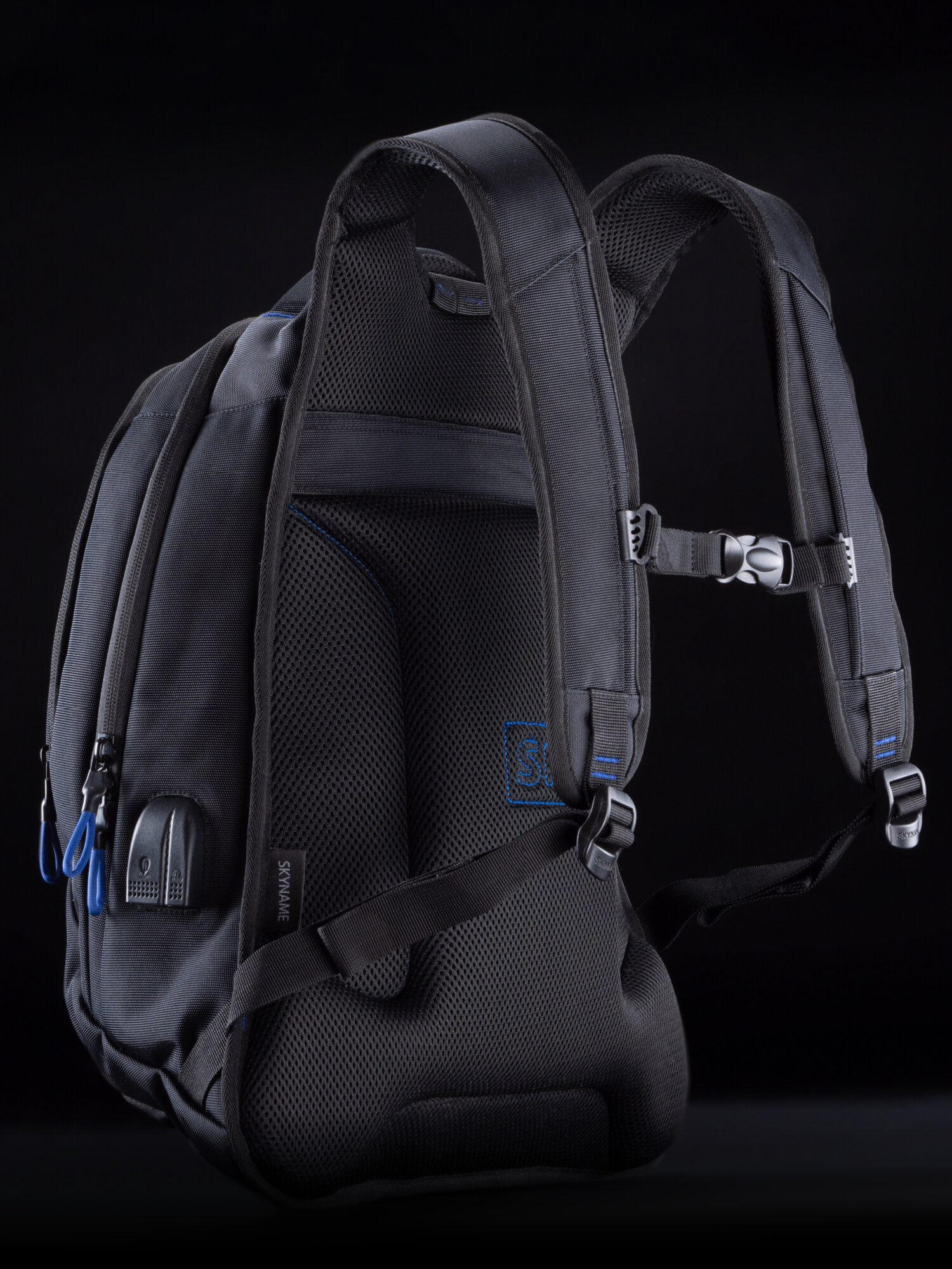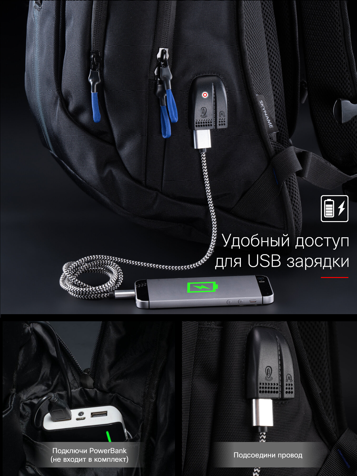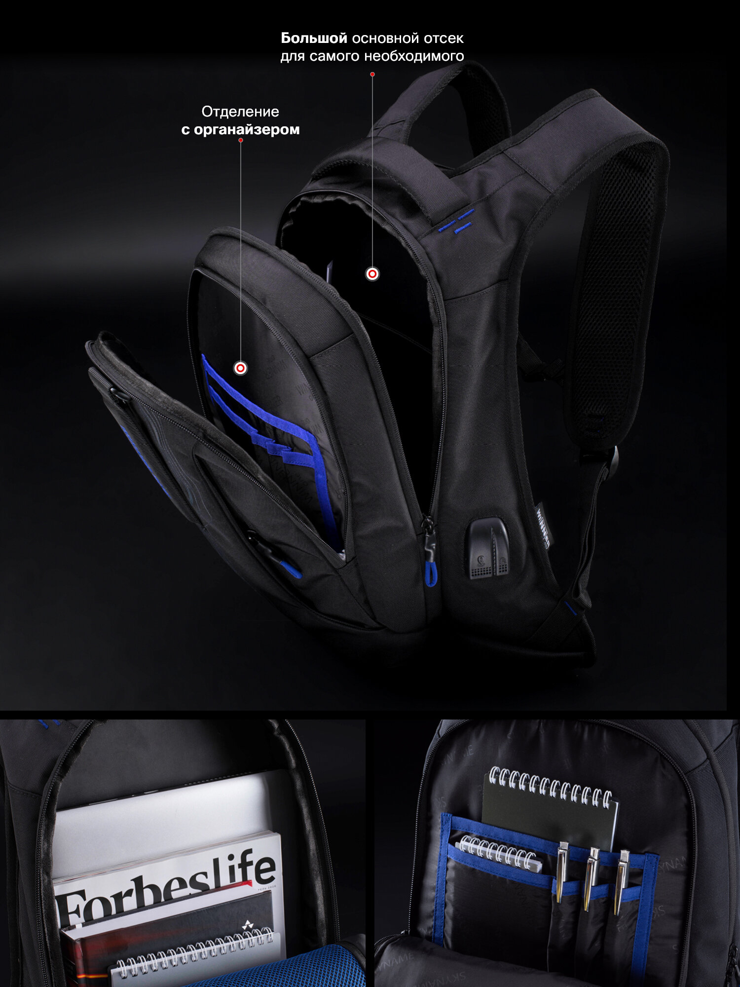 Рюкзак школьный для мальчика 20 л А4, черный для ноутбука городской анатомическая спинка + USB, SkyName (СкайНейм)