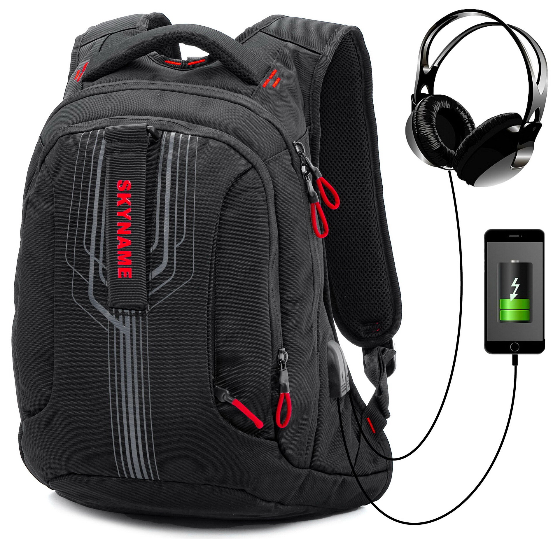 Рюкзак школьный мужской черный для мальчика подростка 30 л с анатомической спинкой SkyName (СкайНейм), со слотом USB и входом для наушников