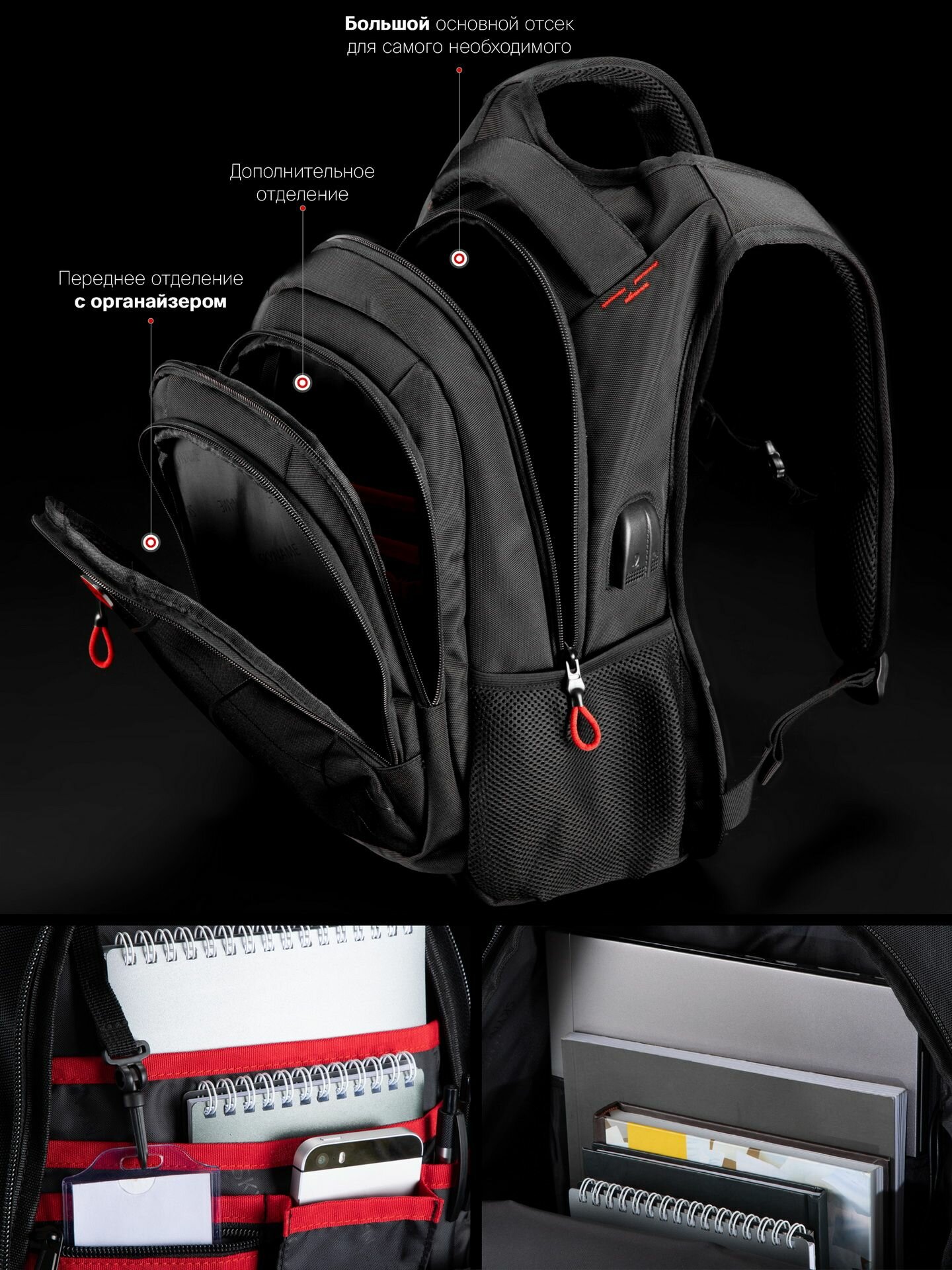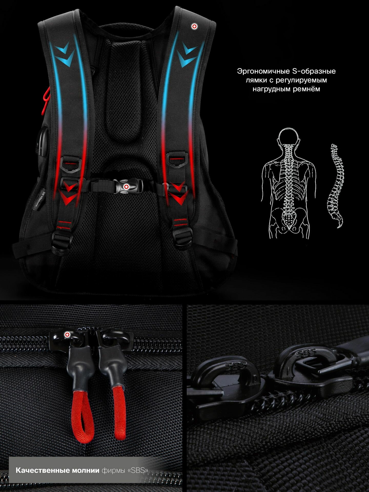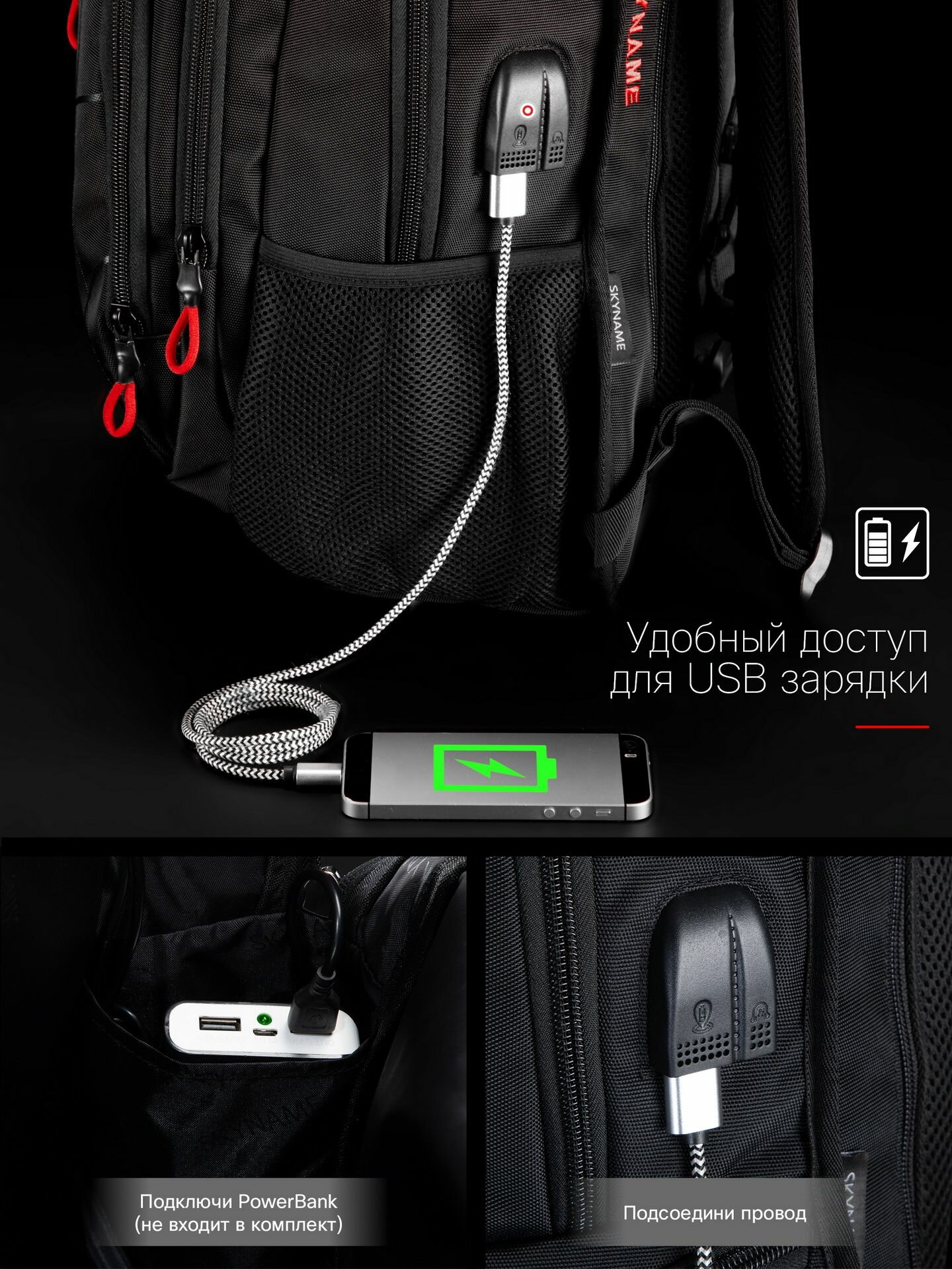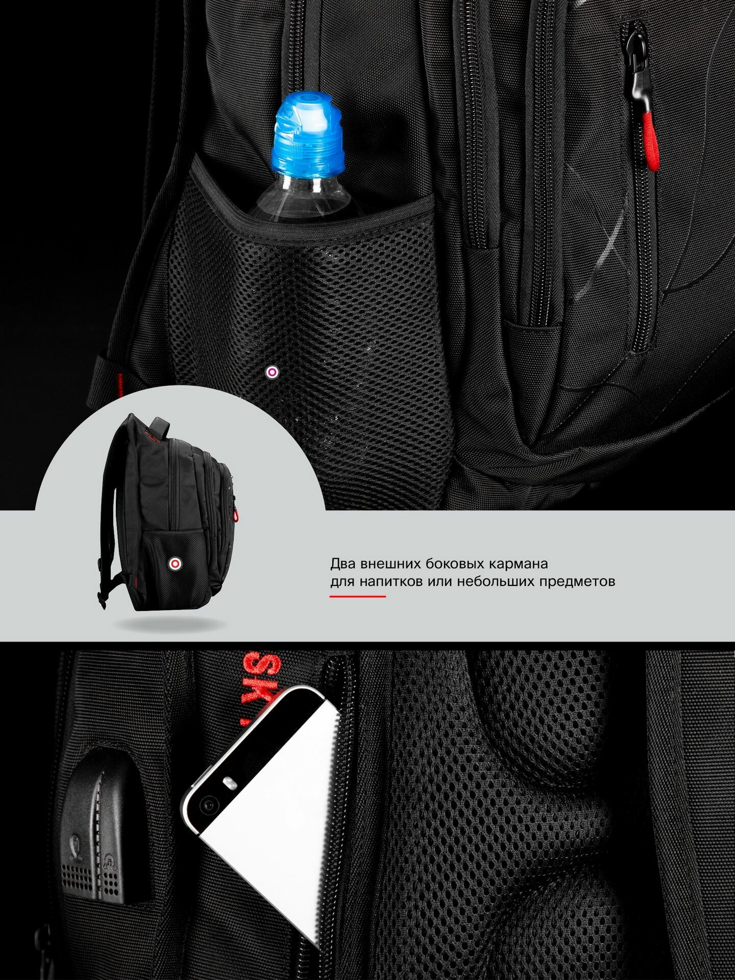 Рюкзак школьный для мальчика 20 л А4, черный для ноутбука городской анатомическая спинка + USB, SkyName (СкайНейм)