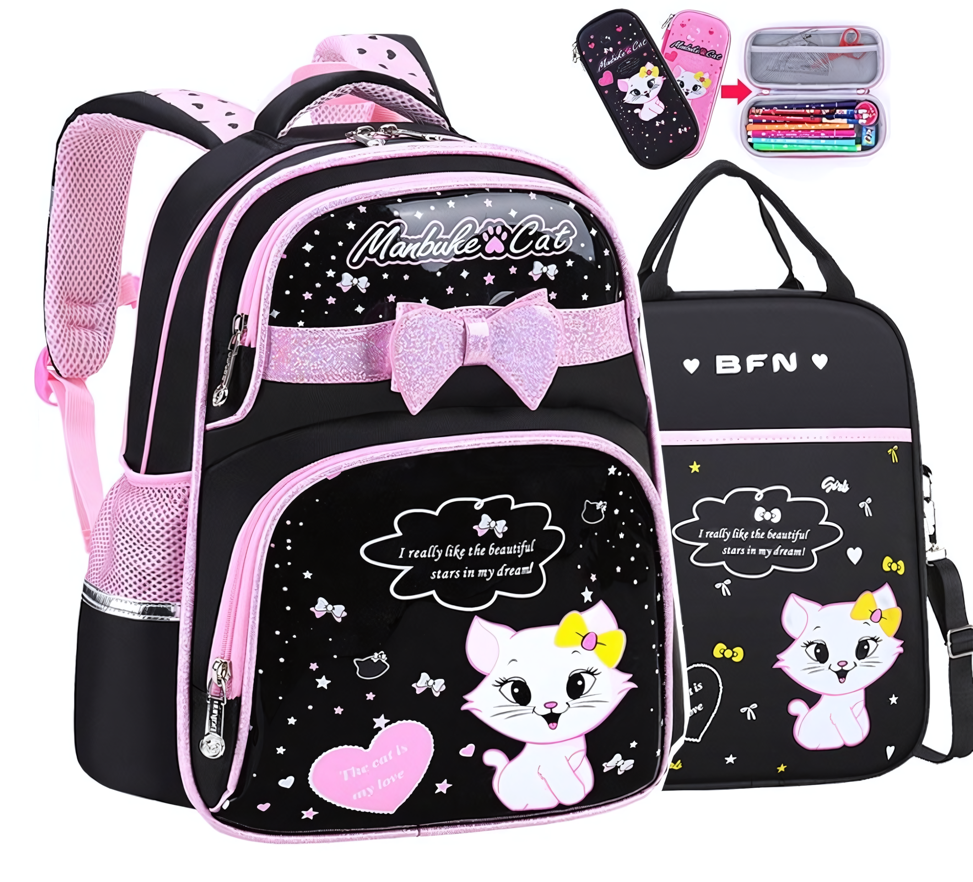 Рюкзак школьный для девочек, 3-6 класс + сумка для занятий + пенал, черный с принтом "кошки" интересное: