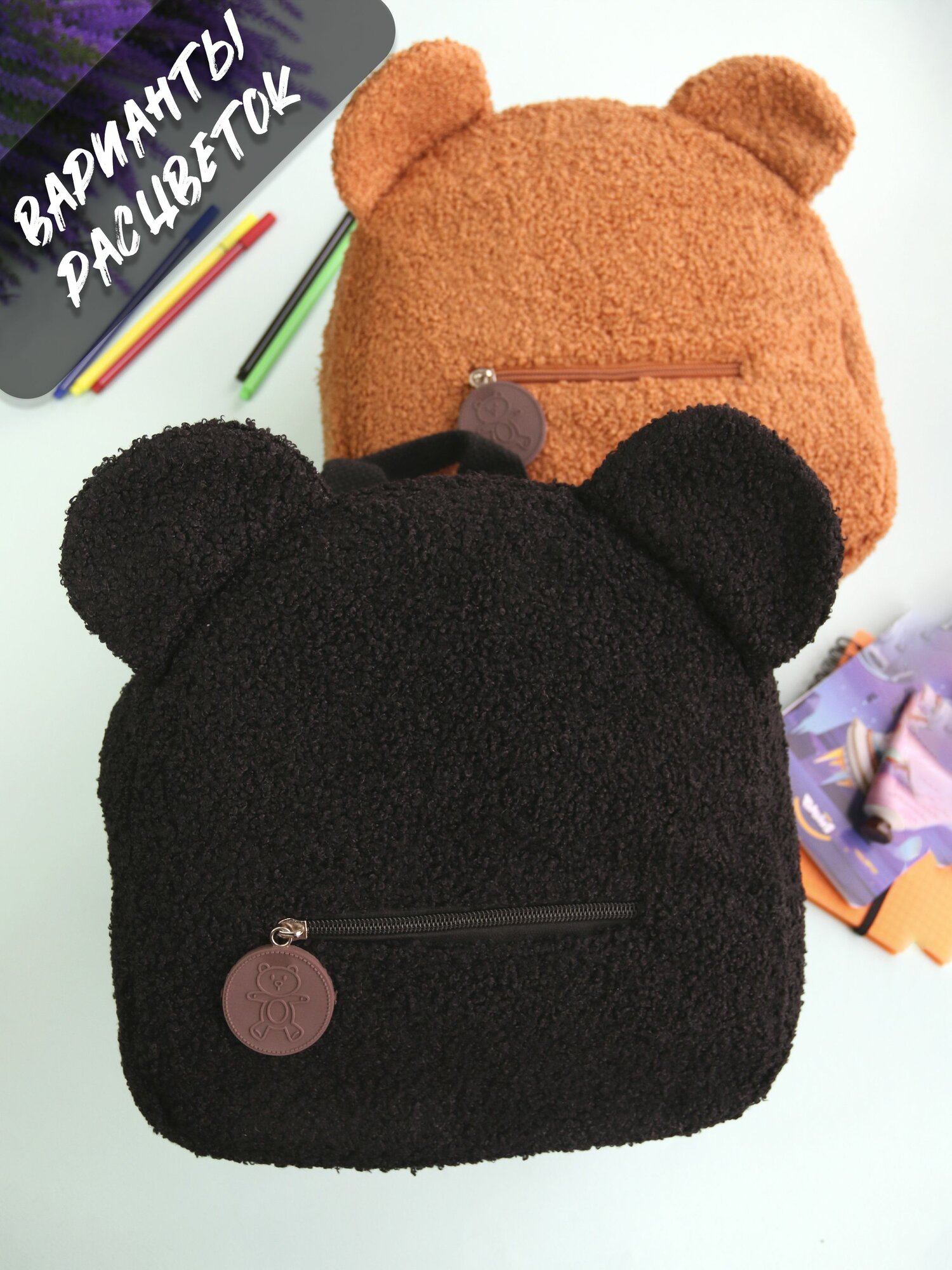 Рюкзак женский маленький городской ранец плюшевый с ушками медвежонок темно-коричневый