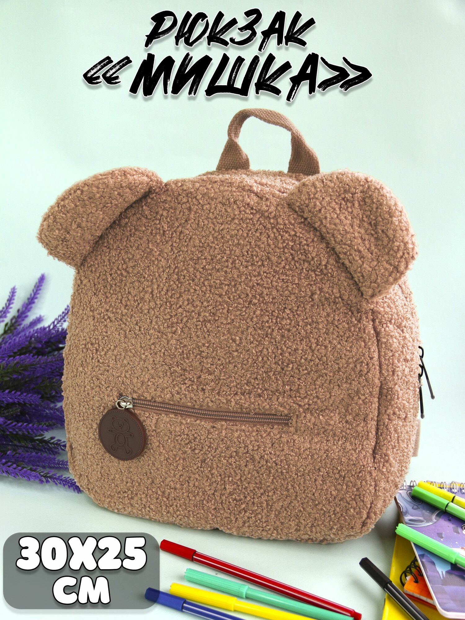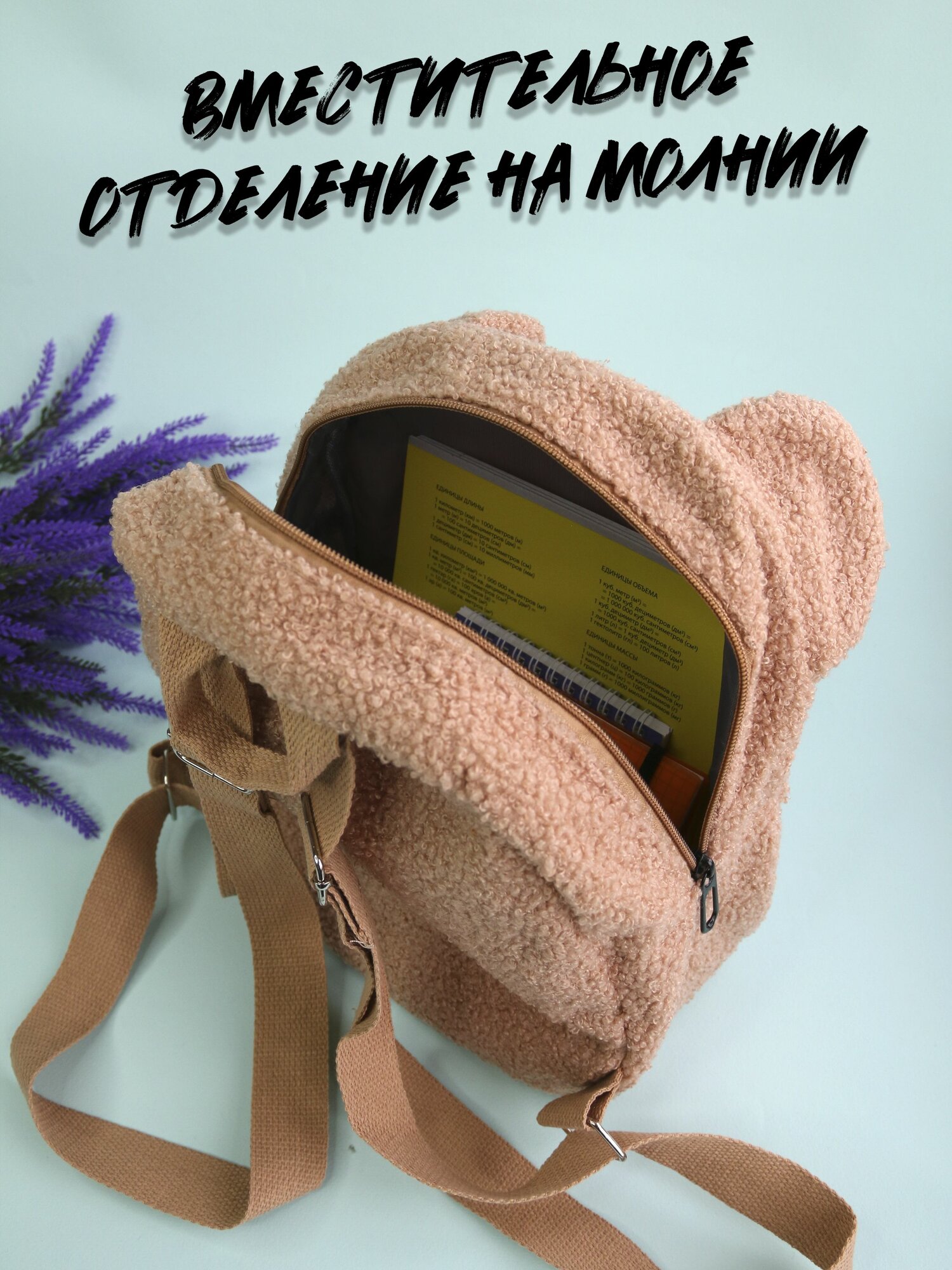 Купить Рюкзак женский маленький городской ранец плюшевый с ушками медвежонок светло-коричневый