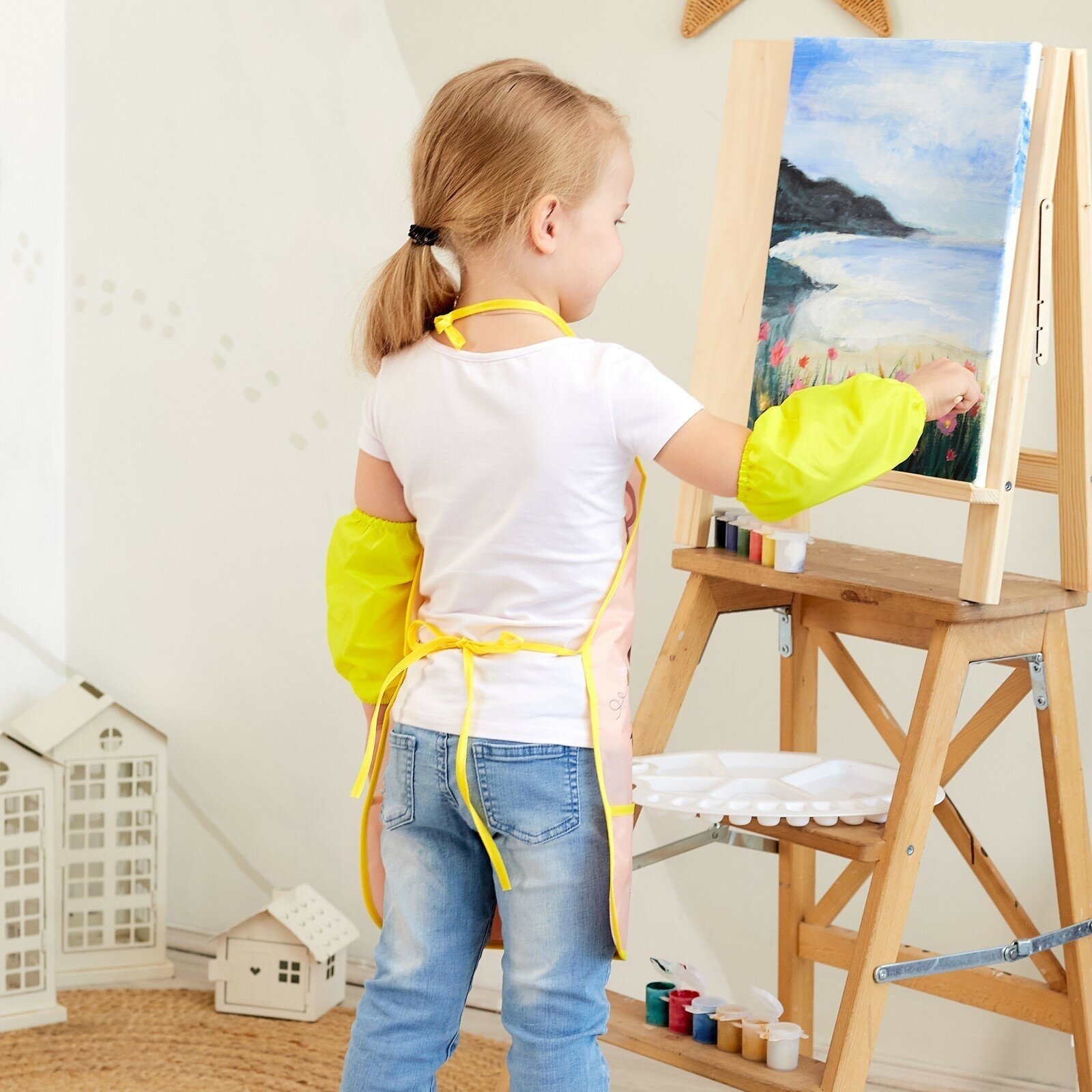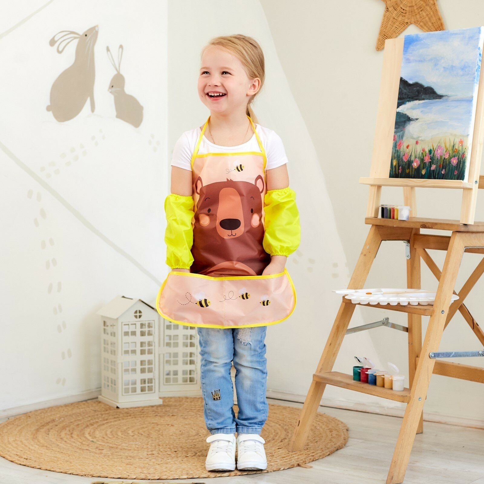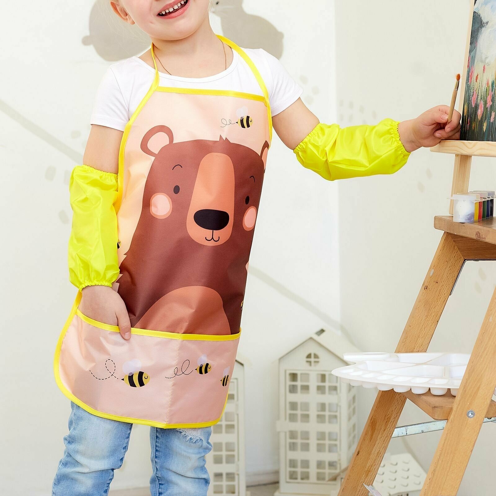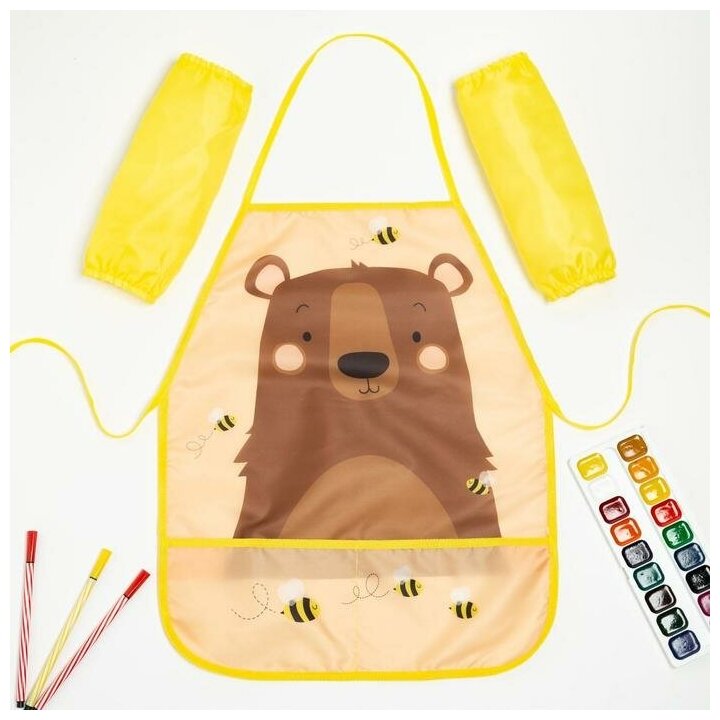 Фартук детский 49х39, для творчества Этель "Мишка", с нарукавниками, на завязках, цвет жёлтый интересное: