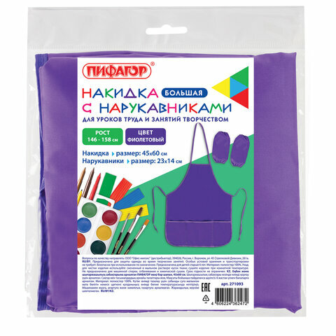Купить Комплект 2 шт, Фартук с нарукавниками для уроков труда пифагор, увеличенный размер, 45х60 см, фиолетовый, 271093