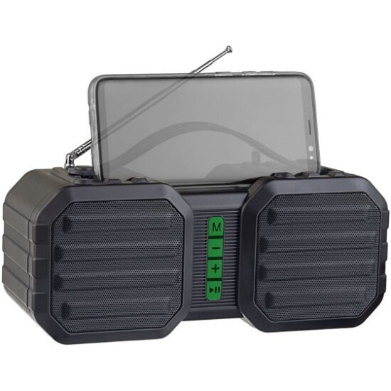 | Плюсы: | Низкая цена. аккуратный немаркий ударопрочный корпус с приятной фактурой типа софт тач или поликарбонат. Телескопическая антена для фм, сморится архаично, но для любителей радио очень выручает. паз для установки телефона или небольшого планшета. крупные и логичные кнопки управления, Легкая защита от грязи и брызг. Приятный звук, емкий аккум для такой цены. удобная резиновая ручка, не добавляющая габариты. |