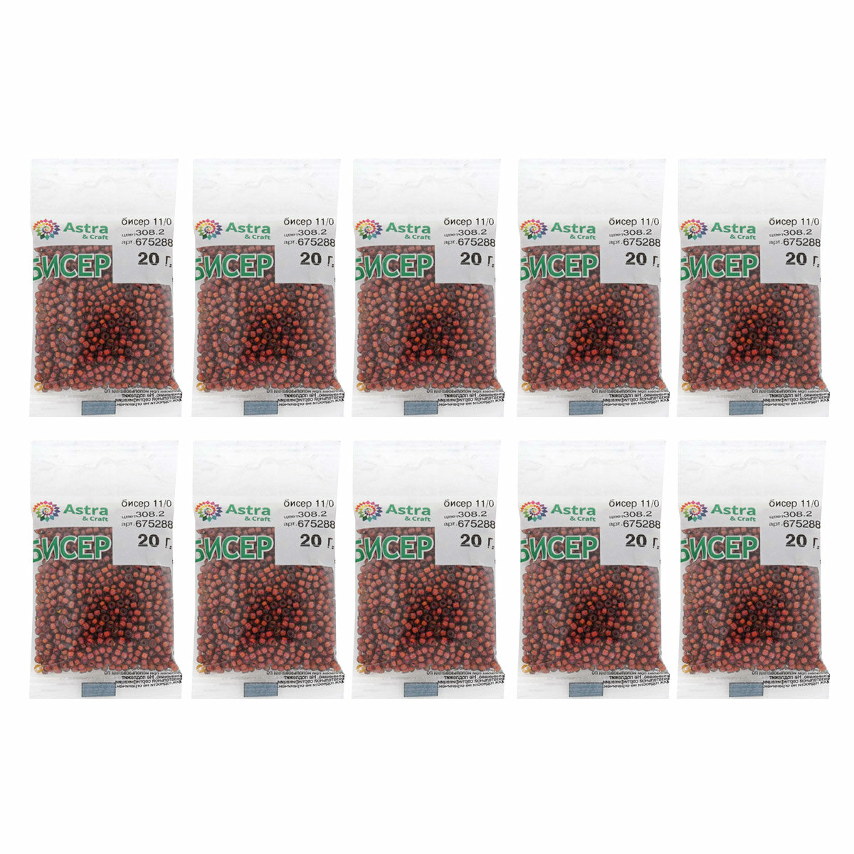 Бисер для плетения 11/0, 20г*10 упак, стекло, Astra&Craft (316-О кирпичный, прозрачный с цветным центром)