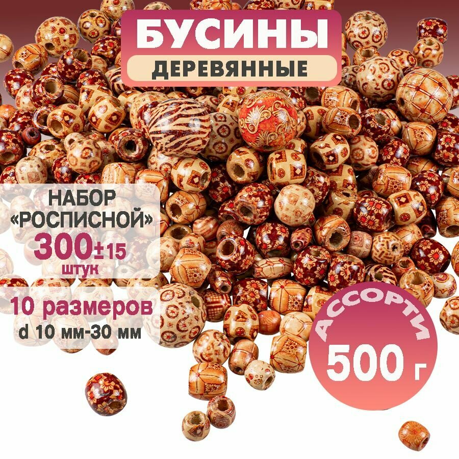 Купить Набор деревянных бусин с росписью, размер от 10 до 30 мм, 300 штук, ассорти 500 г,
