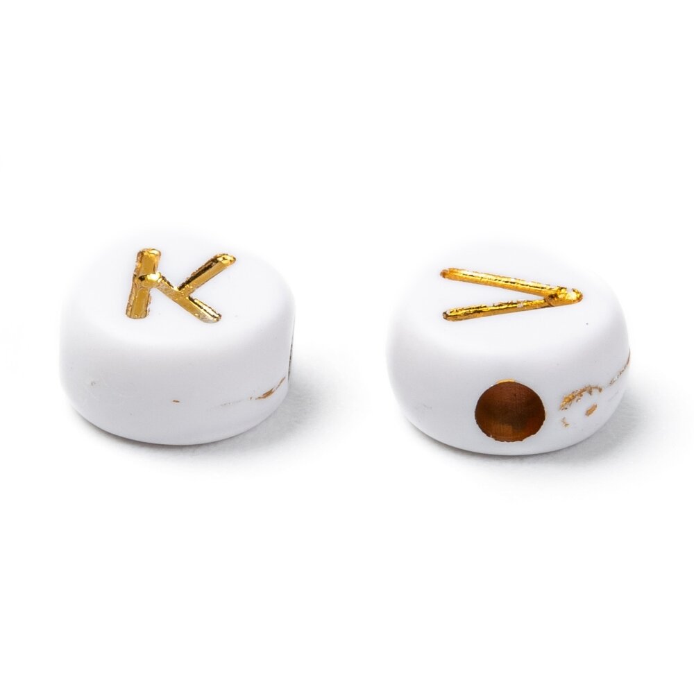 Купить Бусины акриловые, 7х4мм, английские буквы, белые с золотым, 10 грамм