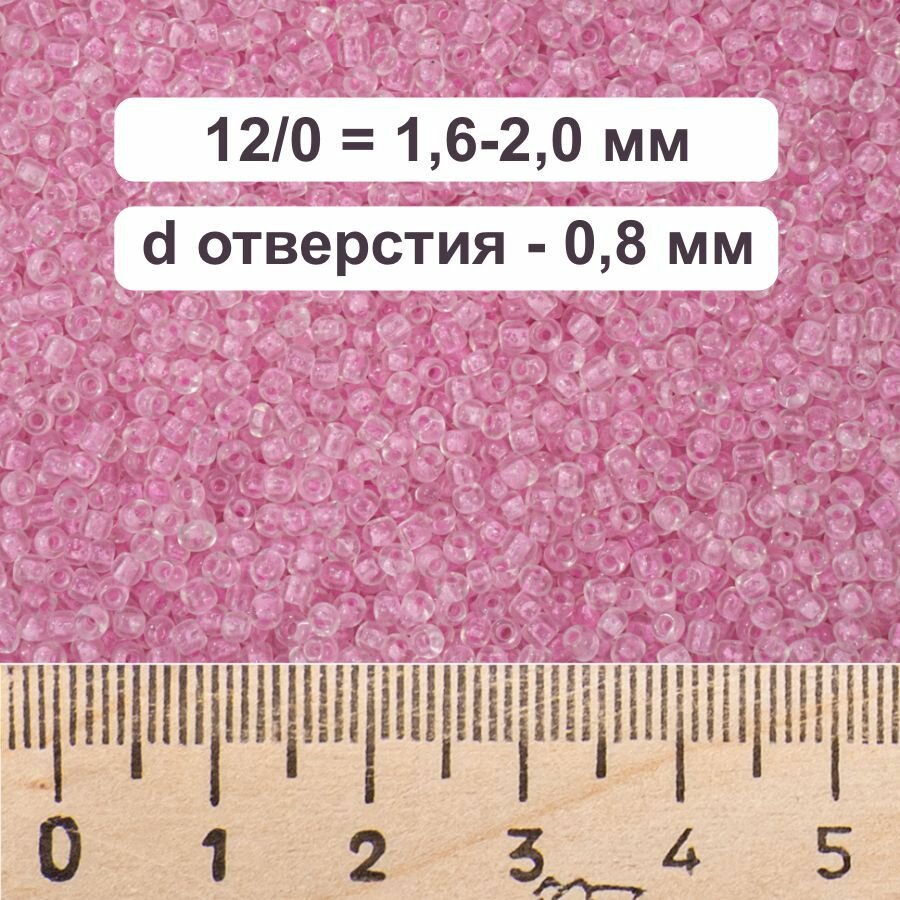 Бисер 12/0 прозрачный радужный с розовым стержнем №208, 450 гр, некалиброванный