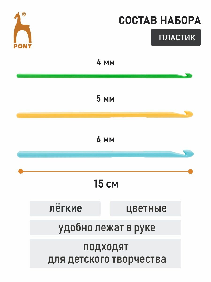 Купить 44350 Крючки вязальные детские 4,00 /5,00 /6,00 мм/ 15 см, пластик, цветные, 3 шт PONY