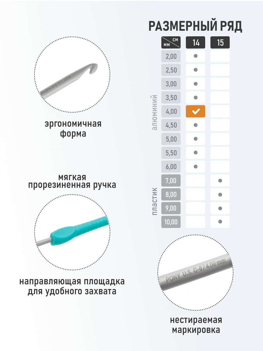 Купить Крючок для вязания с мягкой ручкой, 4мм*14см, алюминий, PONY, 56805