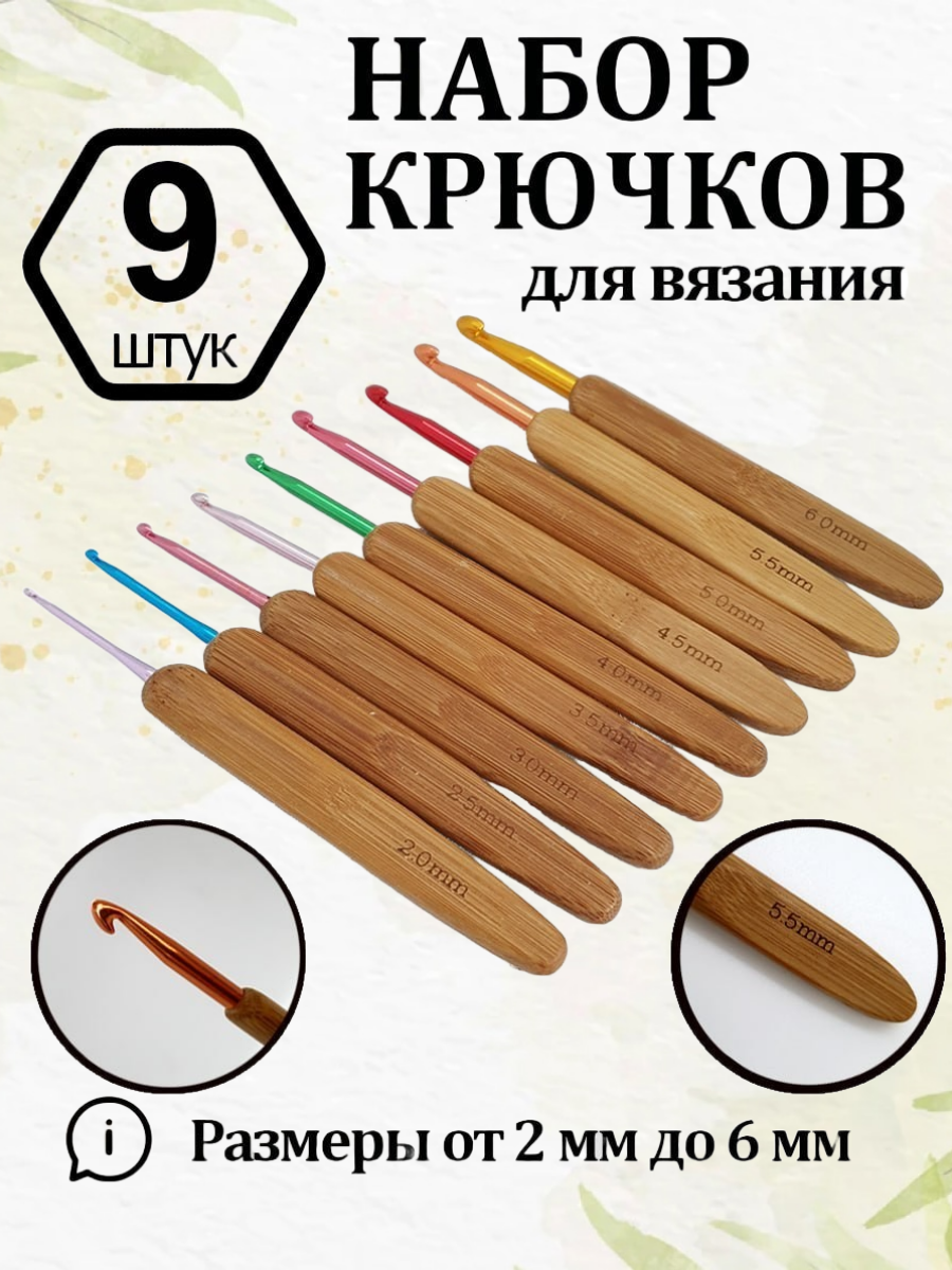 Купить Набор крючков Decorland, 2 - 6 мм, для вязания, с бамбуковой ручкой, 9 шт