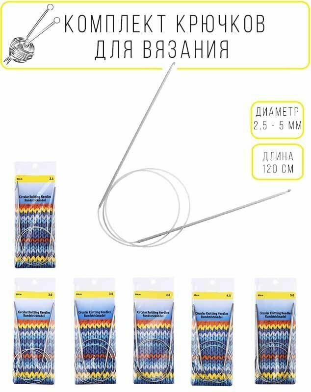 Набор крючков для вязания/ крючки циркулярные на гибком тросике/ диамет 2.5 мм, 3 мм, 3.5 мм, 4мм, 4.5 мм, 5 мм/ длина 60 см/ гибкие металлические