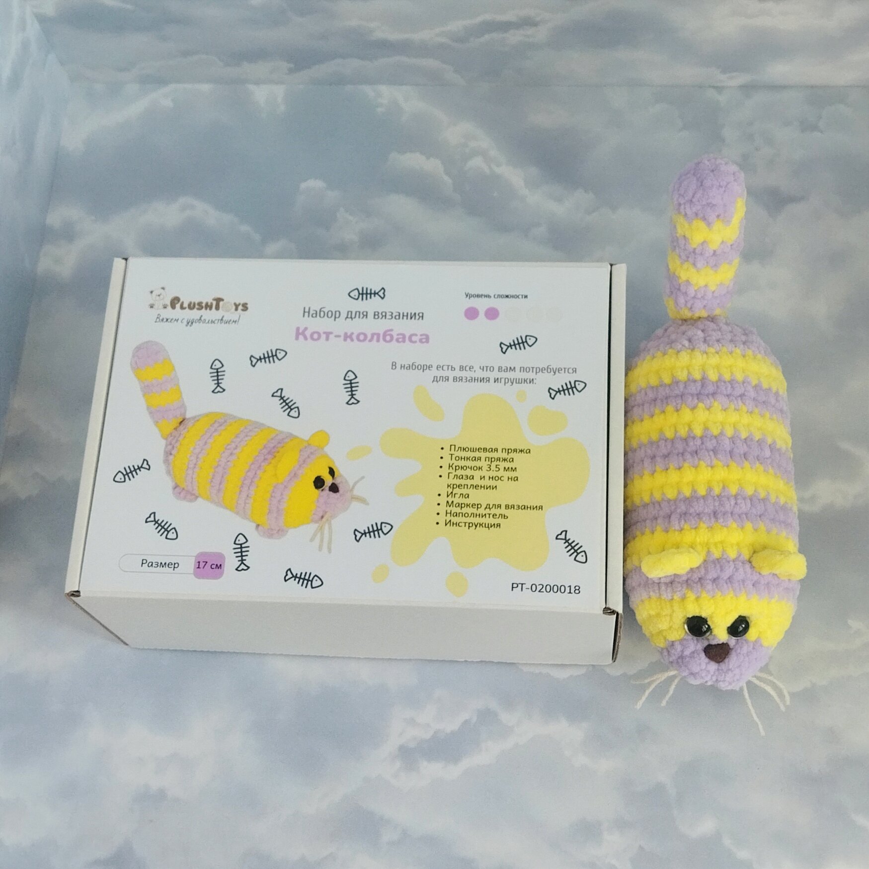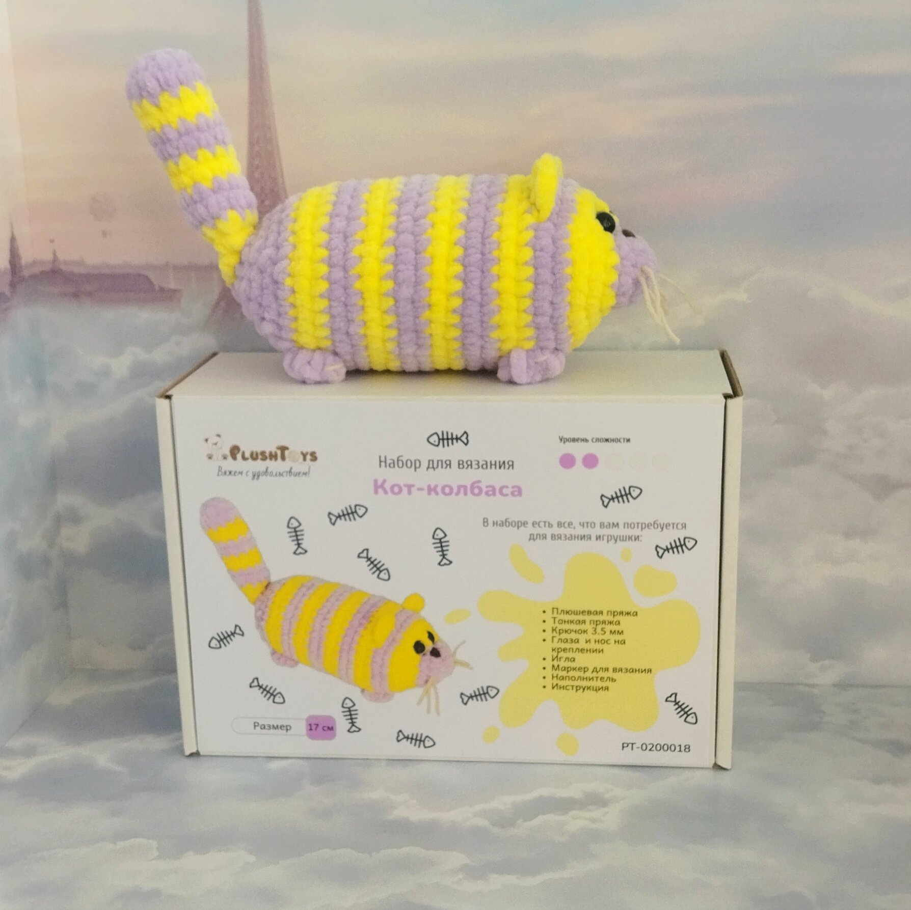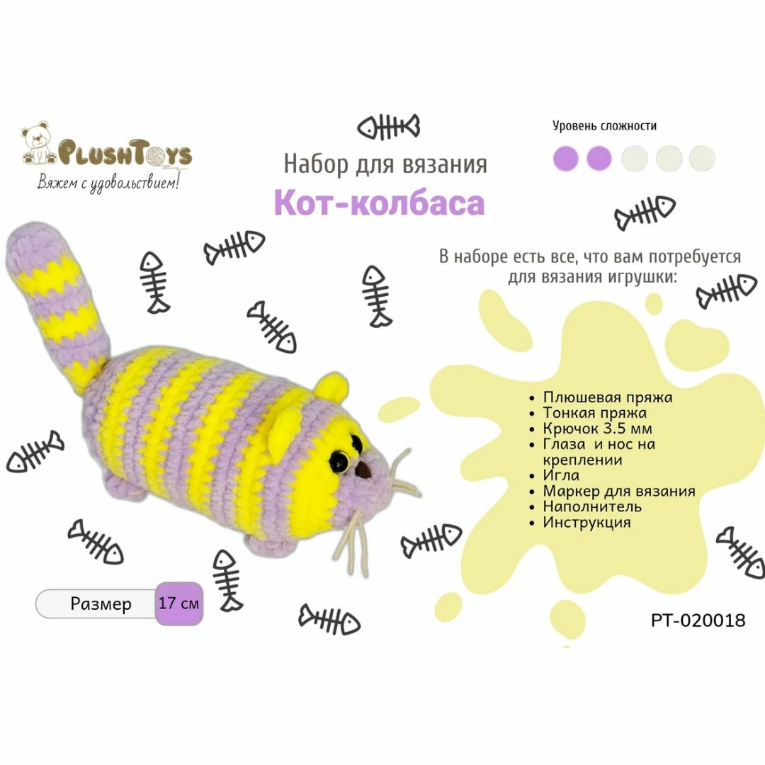 Набор для вязания игрушки крючком "Кот Колбаса", 17см, желто-фиолетовый интересное: