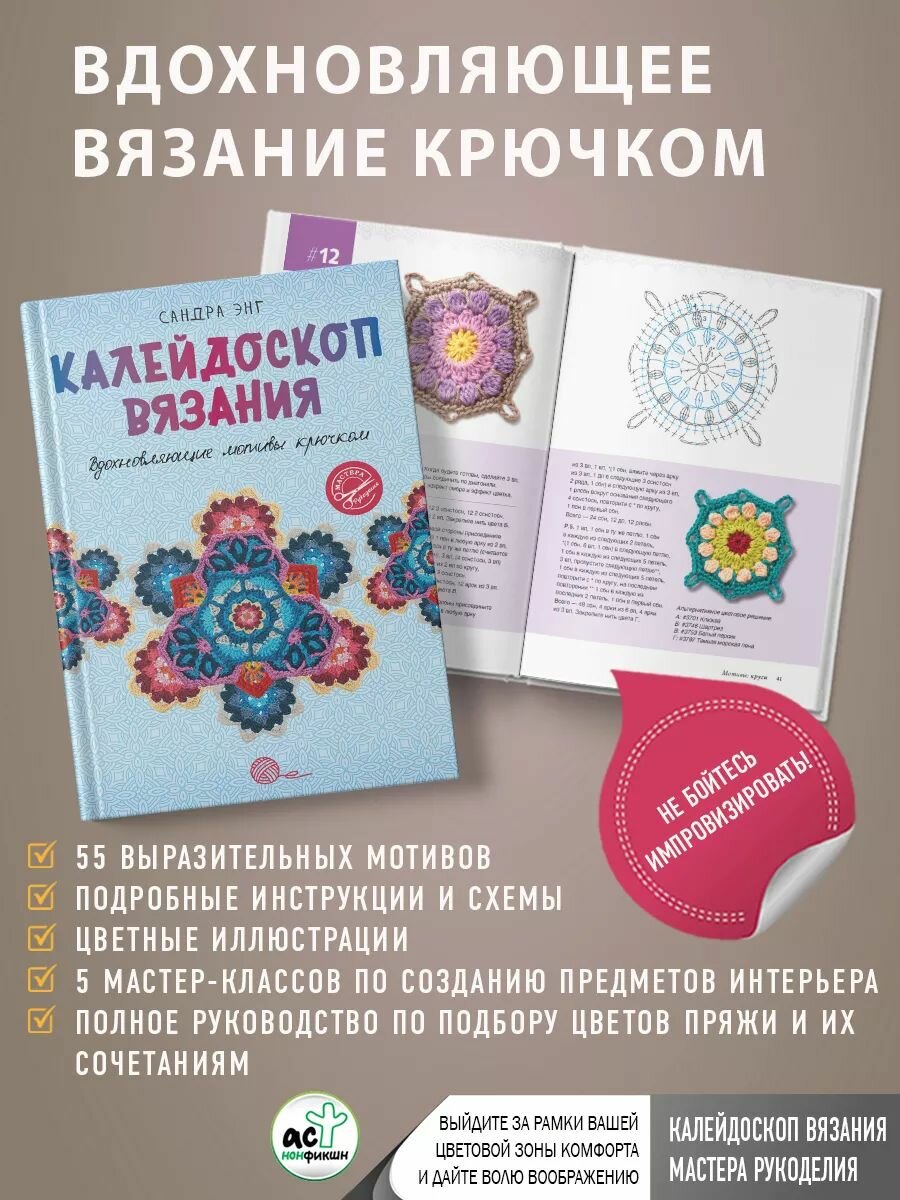 Ниже Вы можете прочитать отзывы на Калейдоскоп вязания. Вдохновляющие мотивы крючком, ознакомится с подробными характеристиками, посмотреть интересные обзоры и фотографии на Калейдоскоп вязания. Вдохновляющие мотивы крючком.