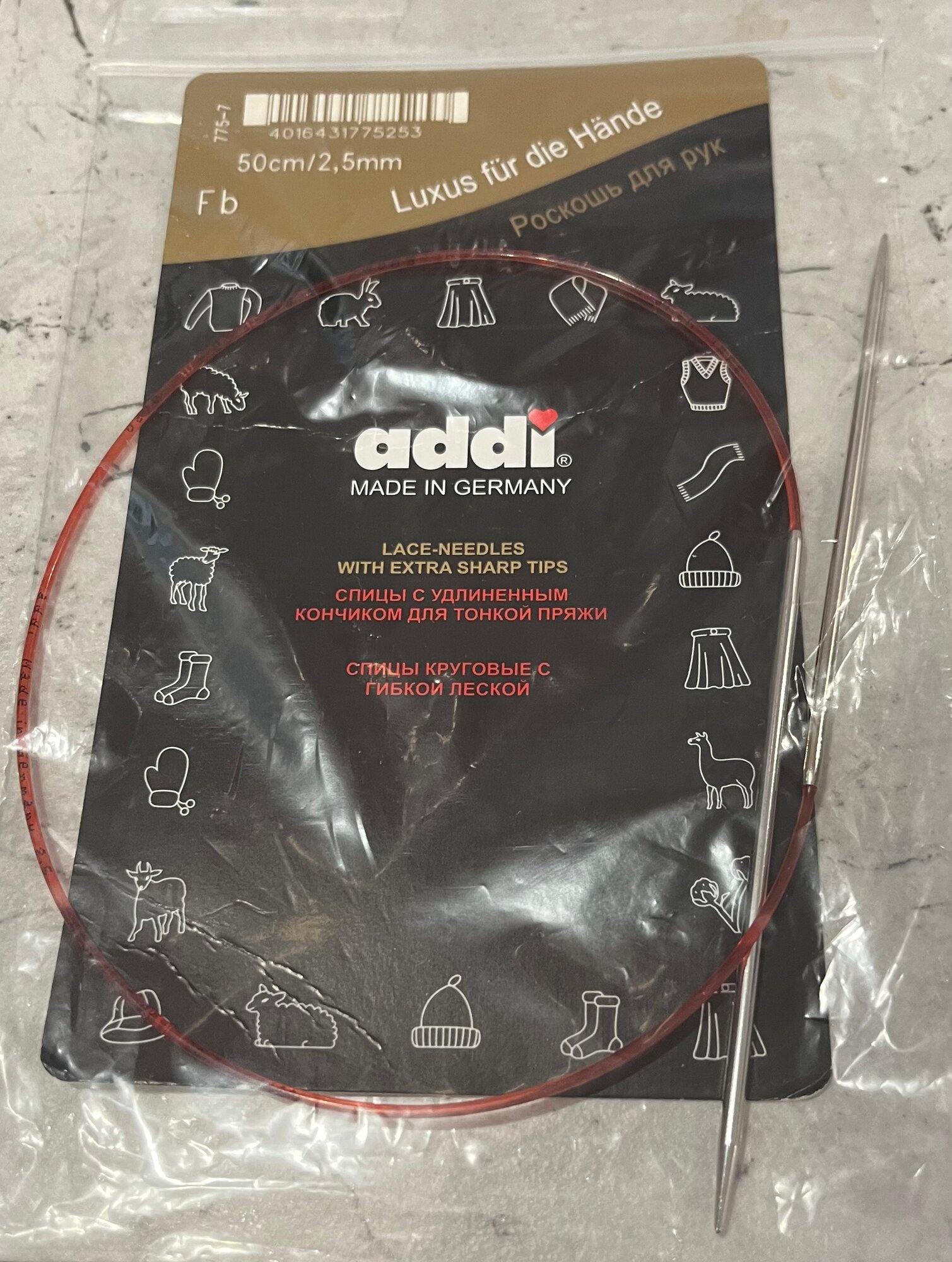 Спицы ADDI круговые с удлиненным кончиком 775-7, диаметр 2.5 мм, длина 9 см, общая длина 50 см, серебристый/красный интересное:
