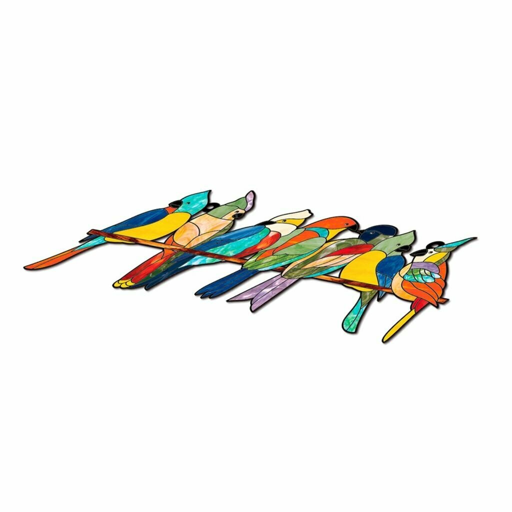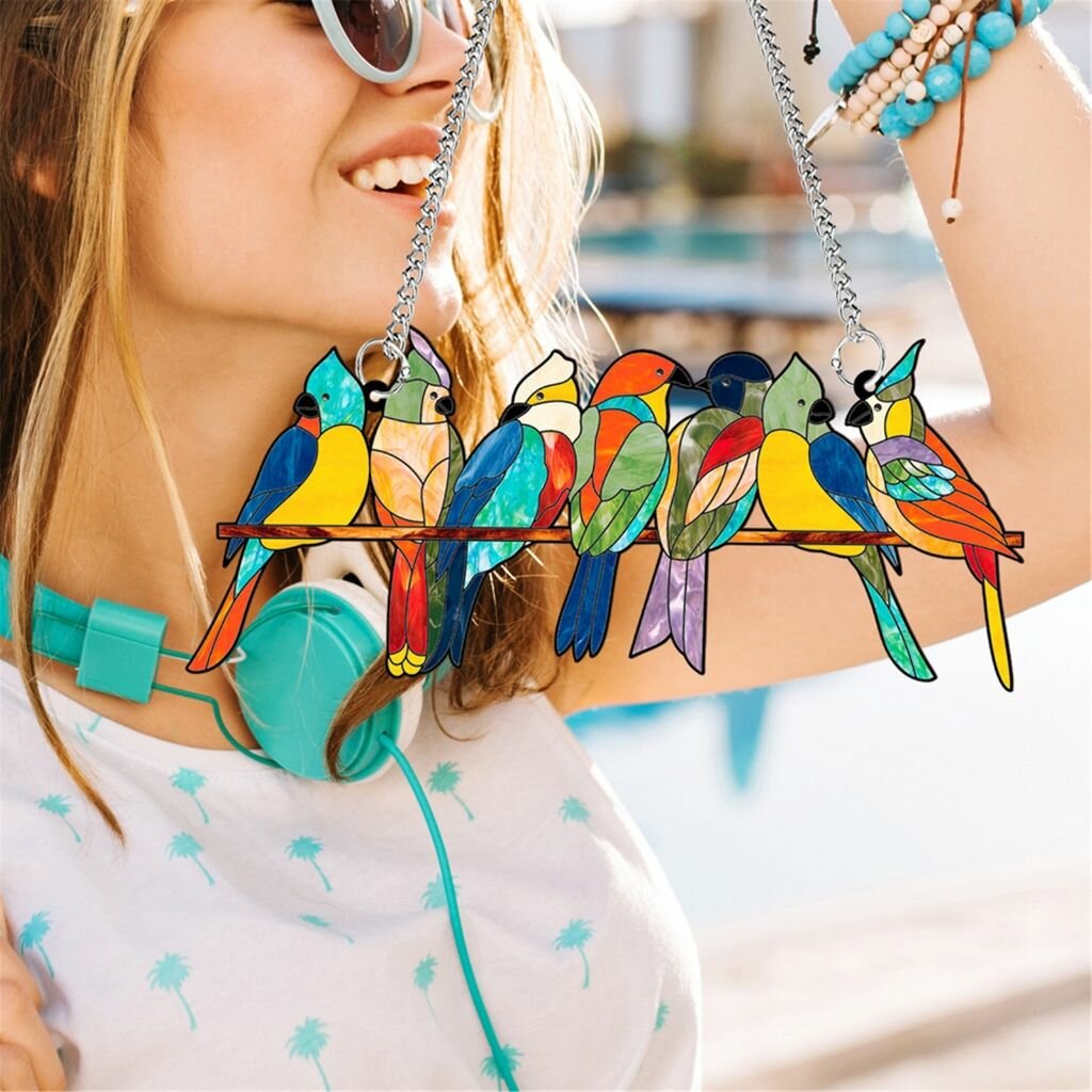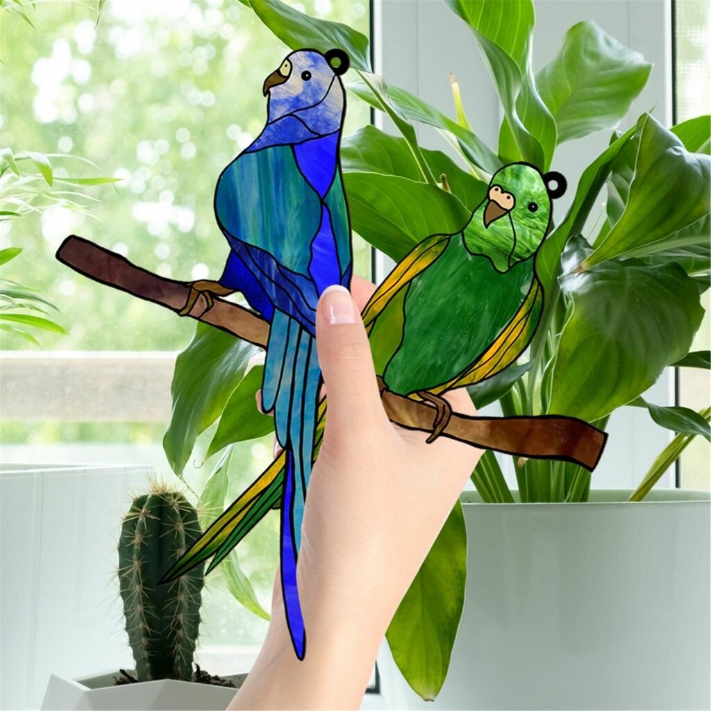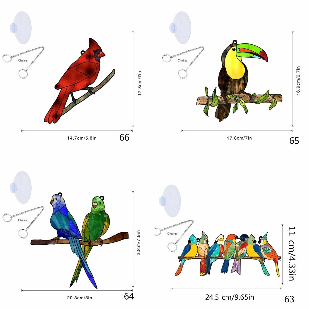Витражные птицы, висящие на окне с акриловым мультяшным орнаментом интересное: