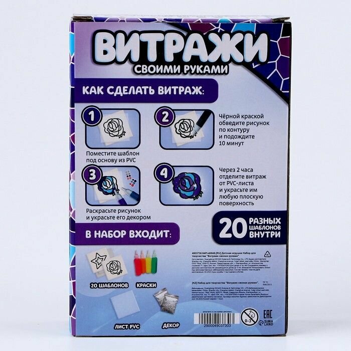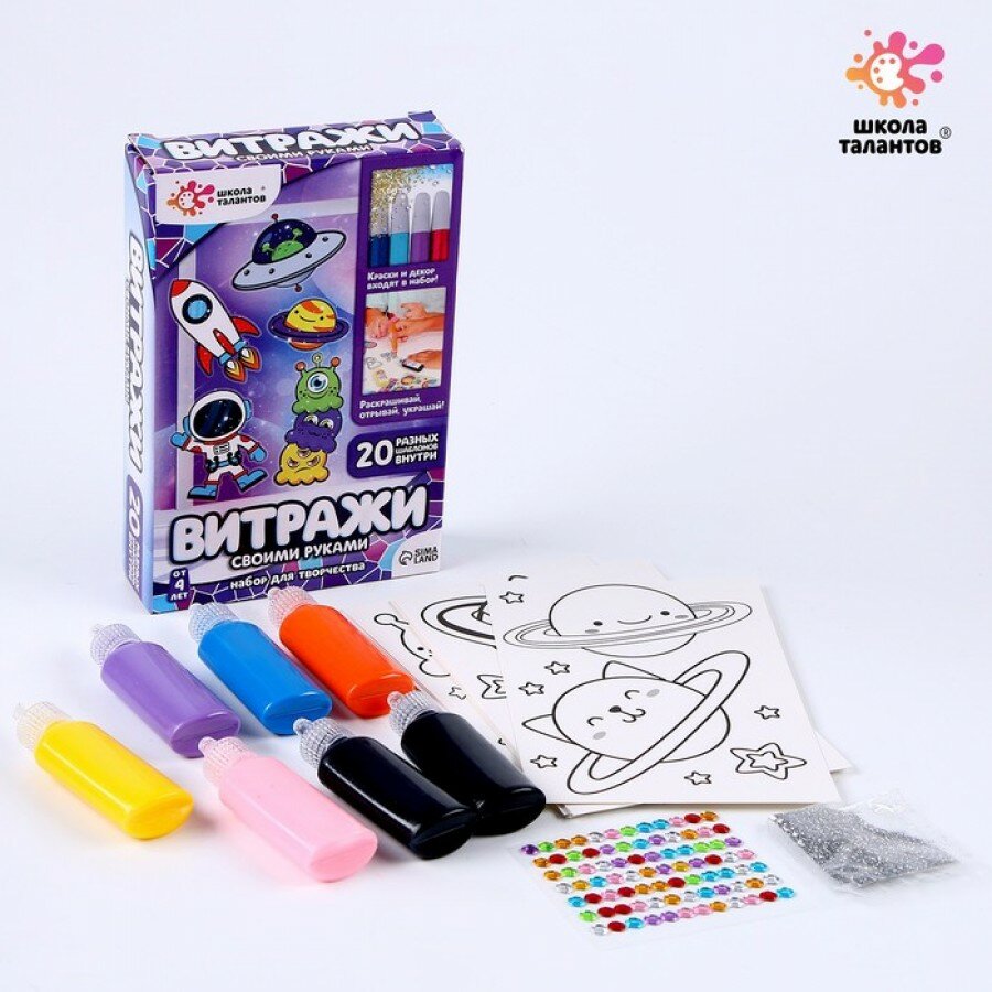Купить Набор для творчества "Раскрась витражики: Космос", детский комплект для создания аппликаций своими руками, 6 ярких красок, стразы с клейким слоем, блестки, 20 трафаретов для витражей, лист ПВС