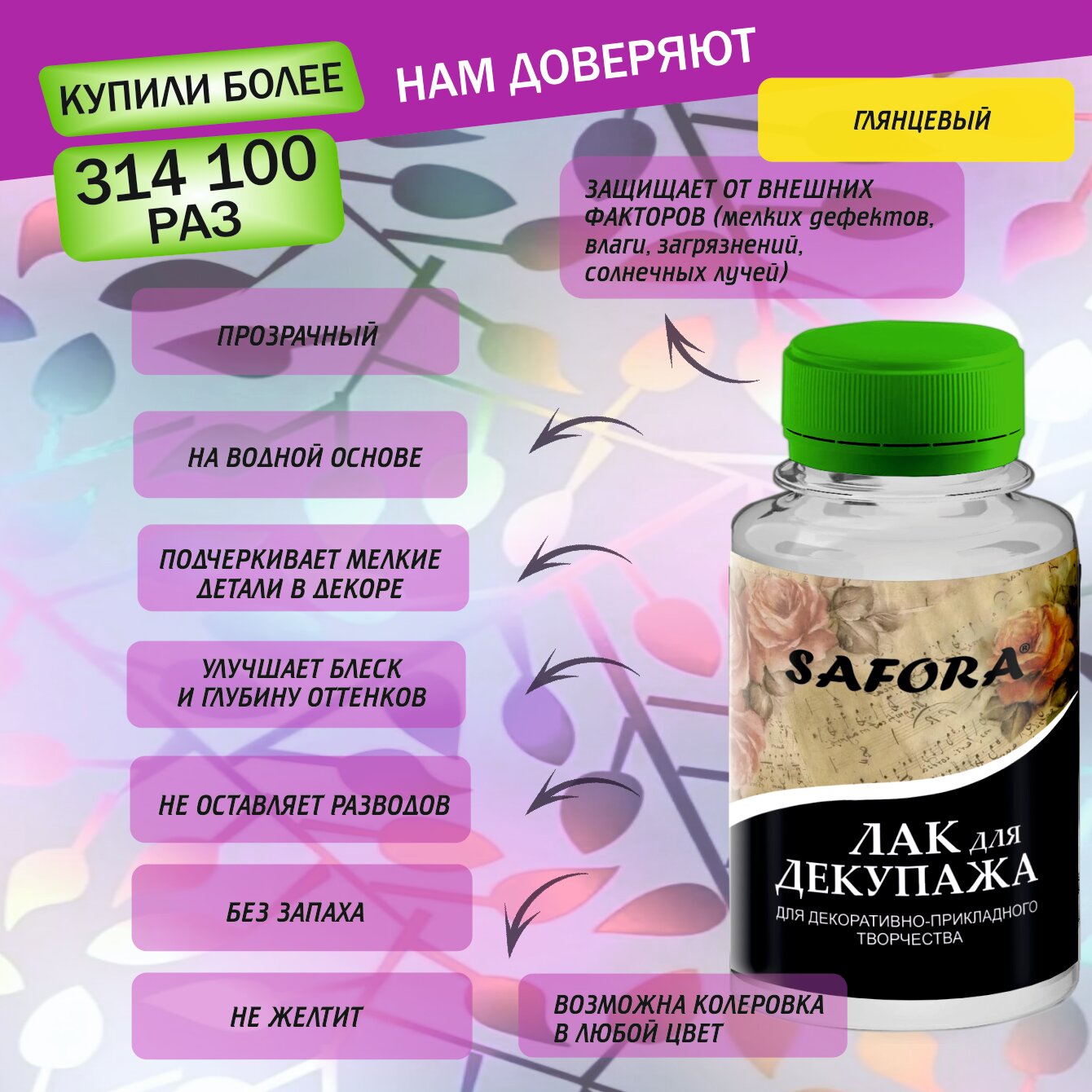 Лак для декупажа SAFORA глянцевый, лак художественный 150г, без запаха интересное: