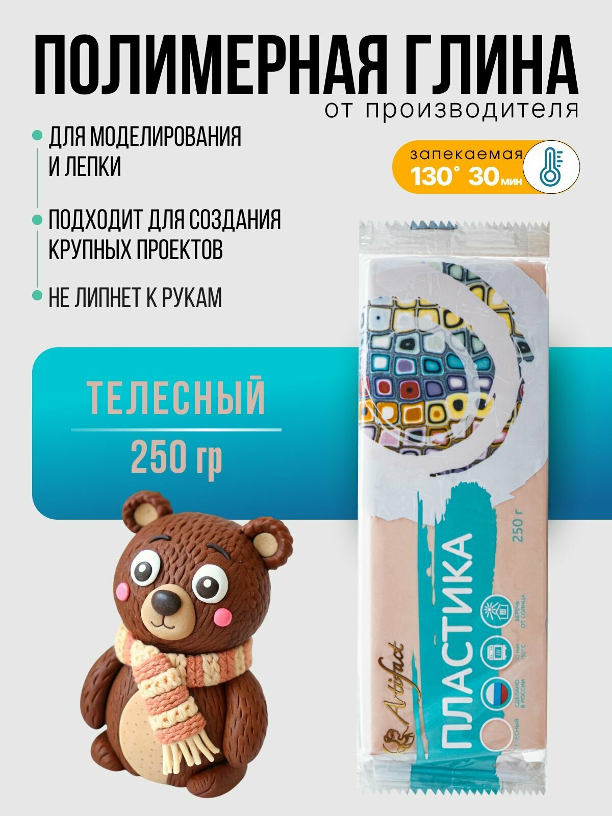 Полимерная глина телесная светлая, пластика запекаемая Артефакт, брус 250 г