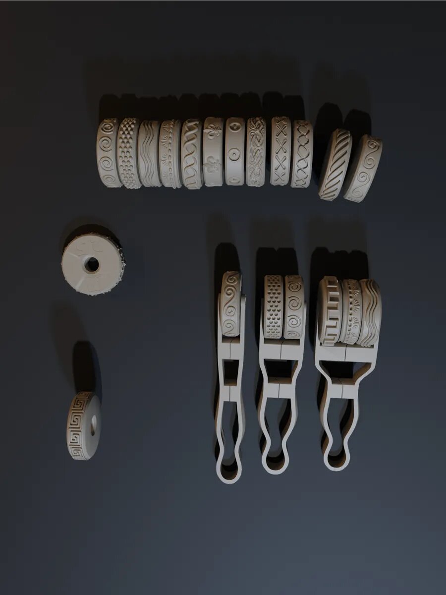 20 текстурных роликов для глины размером 40х11 мм. в комплекте с ручками интересное:
