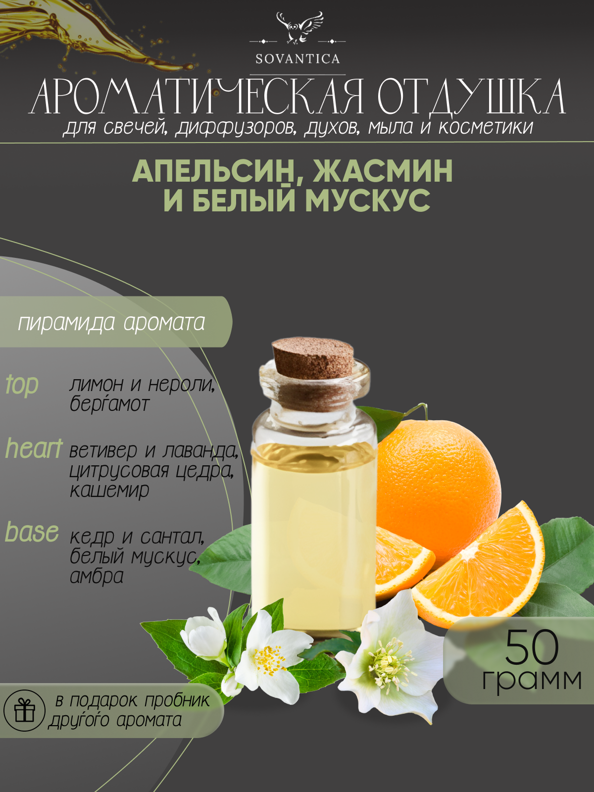 Ароматическая отдушка Апельсин, жасмин и белый мускус 50гр Sovantica интересное:
