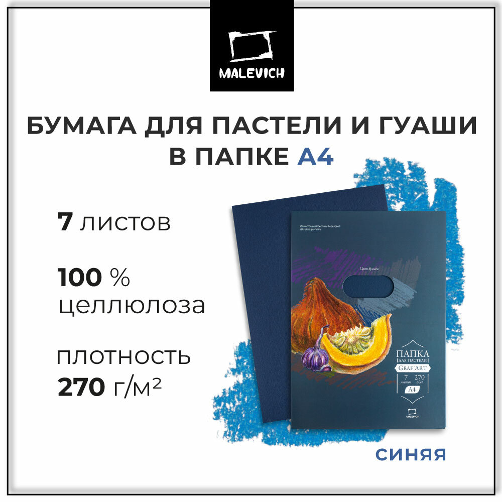 Бумага для пастели в папке 7 л, А4, 270г/м², синяя, Малевичъ интересное: