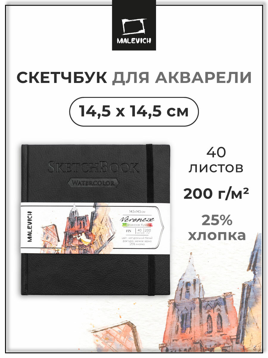 Скетчбук Малевичъ для акварели Veroneze, черный, 200 г/м, 14,5х14,5 см, 40л интересное: