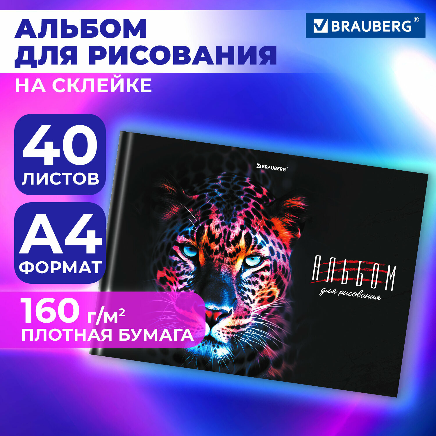 Купить Альбом для рисования в школу А4 40 листов на склейке, плотная бумага 160 г м2, обложка картон, Brauberg Гепард, 107029