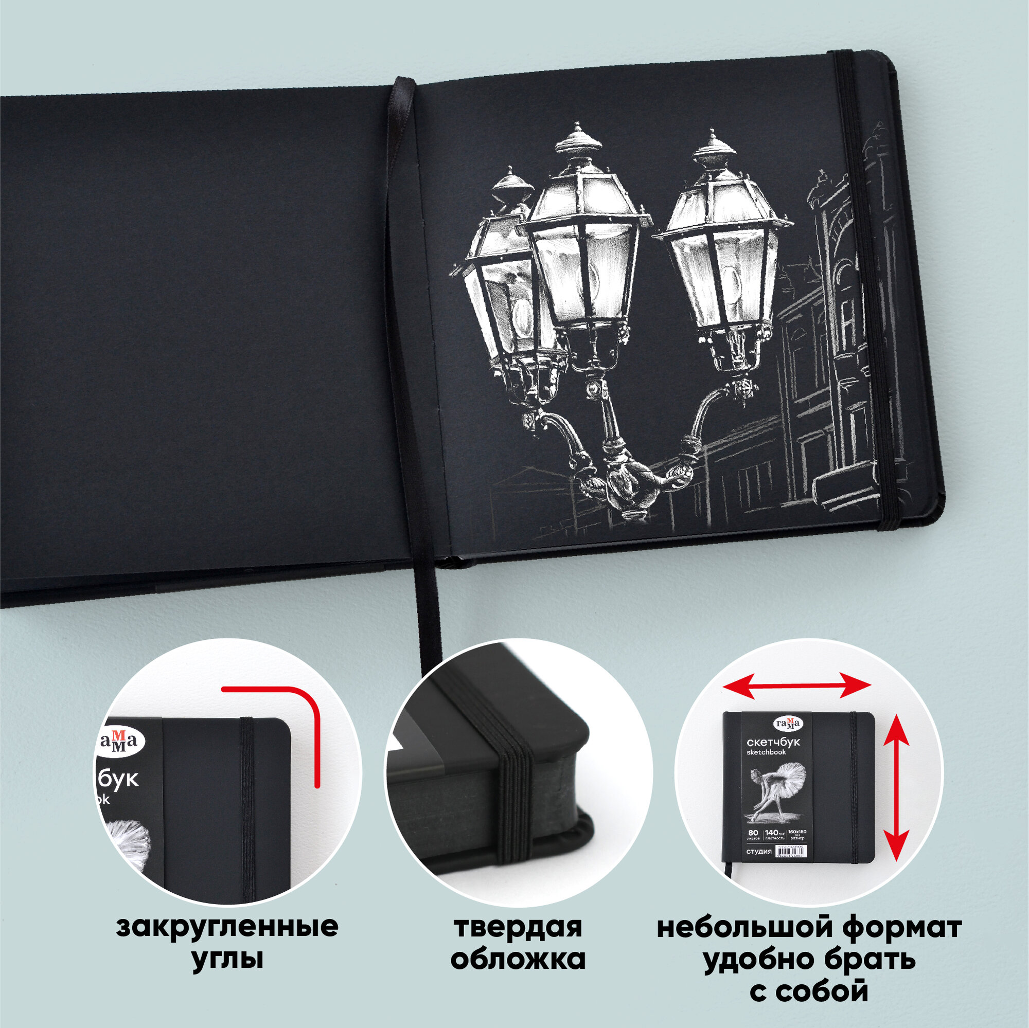 СохранитьСкетчбук 80л, 150*150 Гамма "Студия", черный, твердая обложка, на резинке, черная, 140г/м2 интересное: