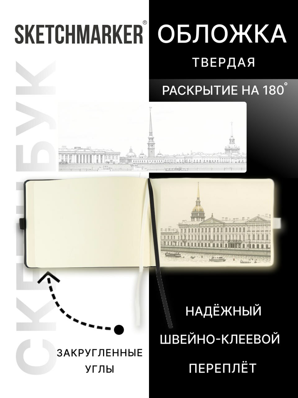 СохранитьСкетчбук для рисования маленький, блокнот для скетчинга Sketchmarker 140г/кв. м 21*14.8cм 80л твердая обложка, цвет черно-белый интересное: