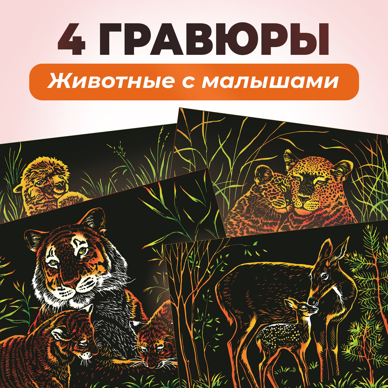 Набор для творчества цветная гравюра скретч картина LORI Животные с малышами, 18х24 см, 4 шт в комплекте, Им-383 интересное:
