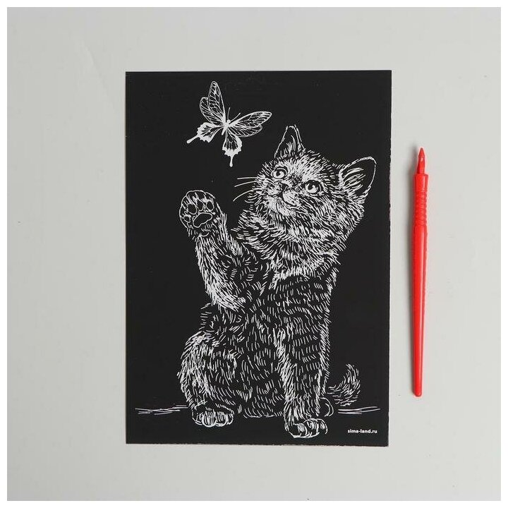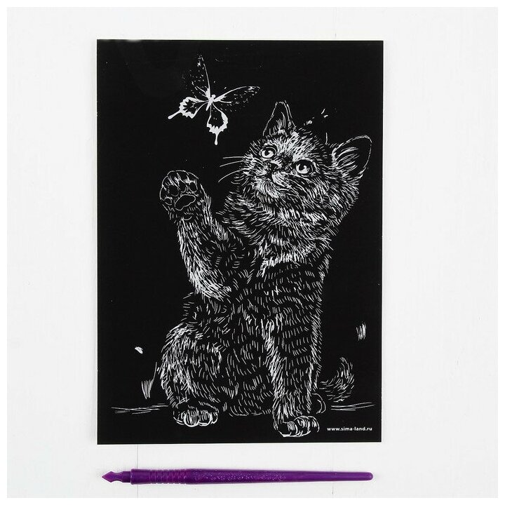 Гравюра "Котёнок и бабочка" с металлическим эффектом "серебро" А5 интересное: