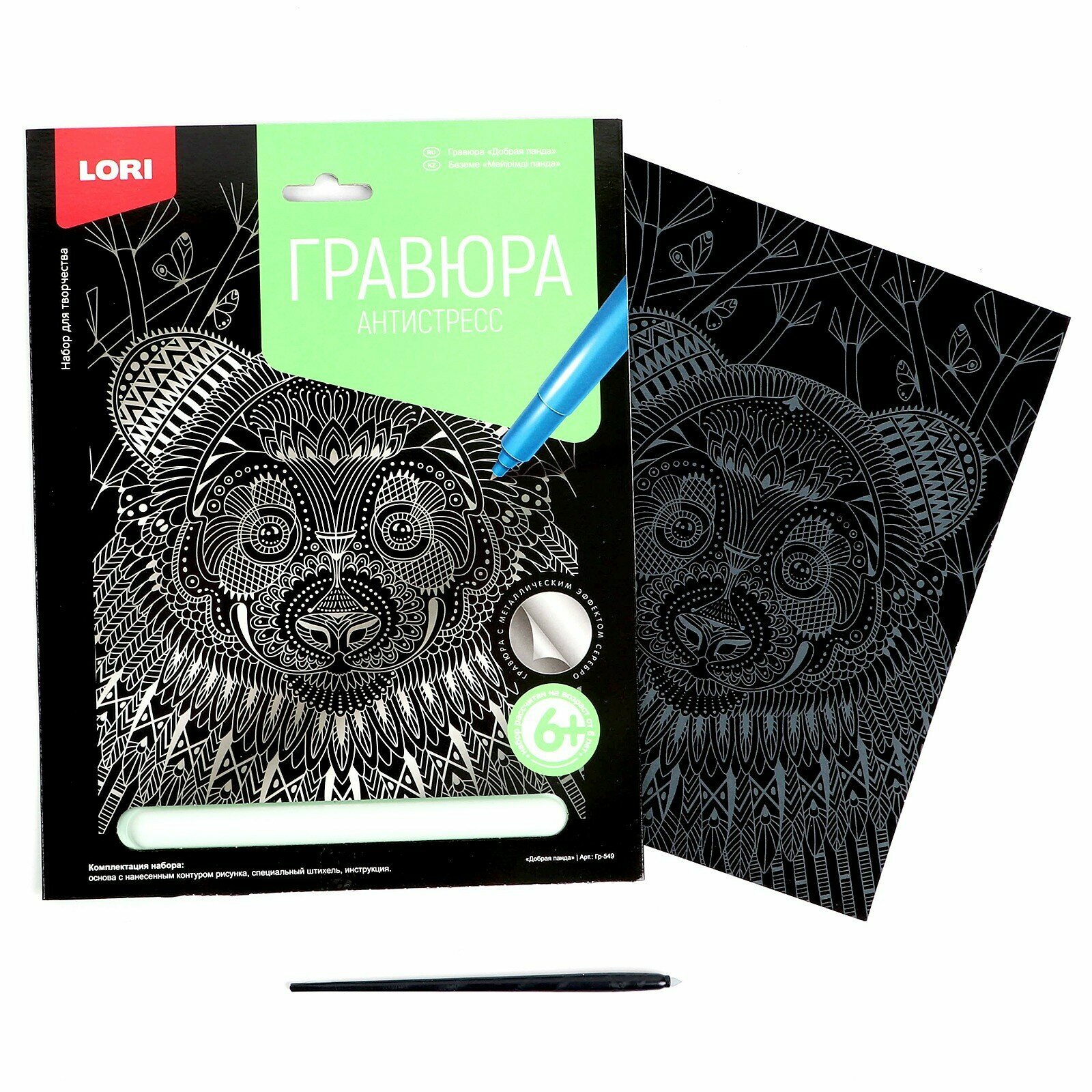 Купить Гравюра большая Антистресс "Добрая панда" с металлическим эффектом Серебро, набор для детского творчества Lori, скретч картина для детей