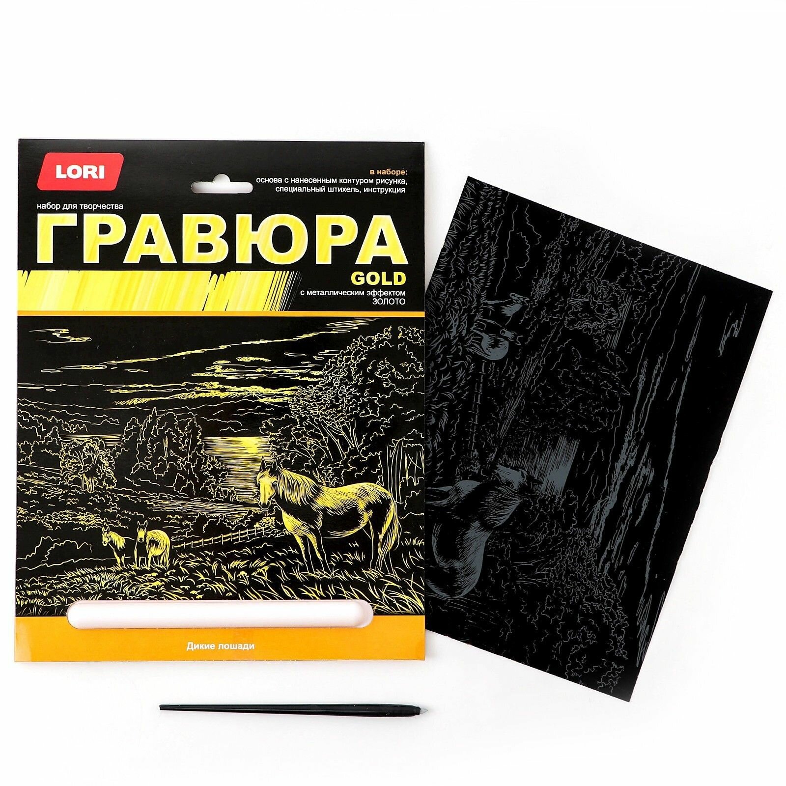 Купить Гравюра большая "Дикие лошади" с металлическим эффектом Золото, набор для детского творчества Lori, скретч картина для детей