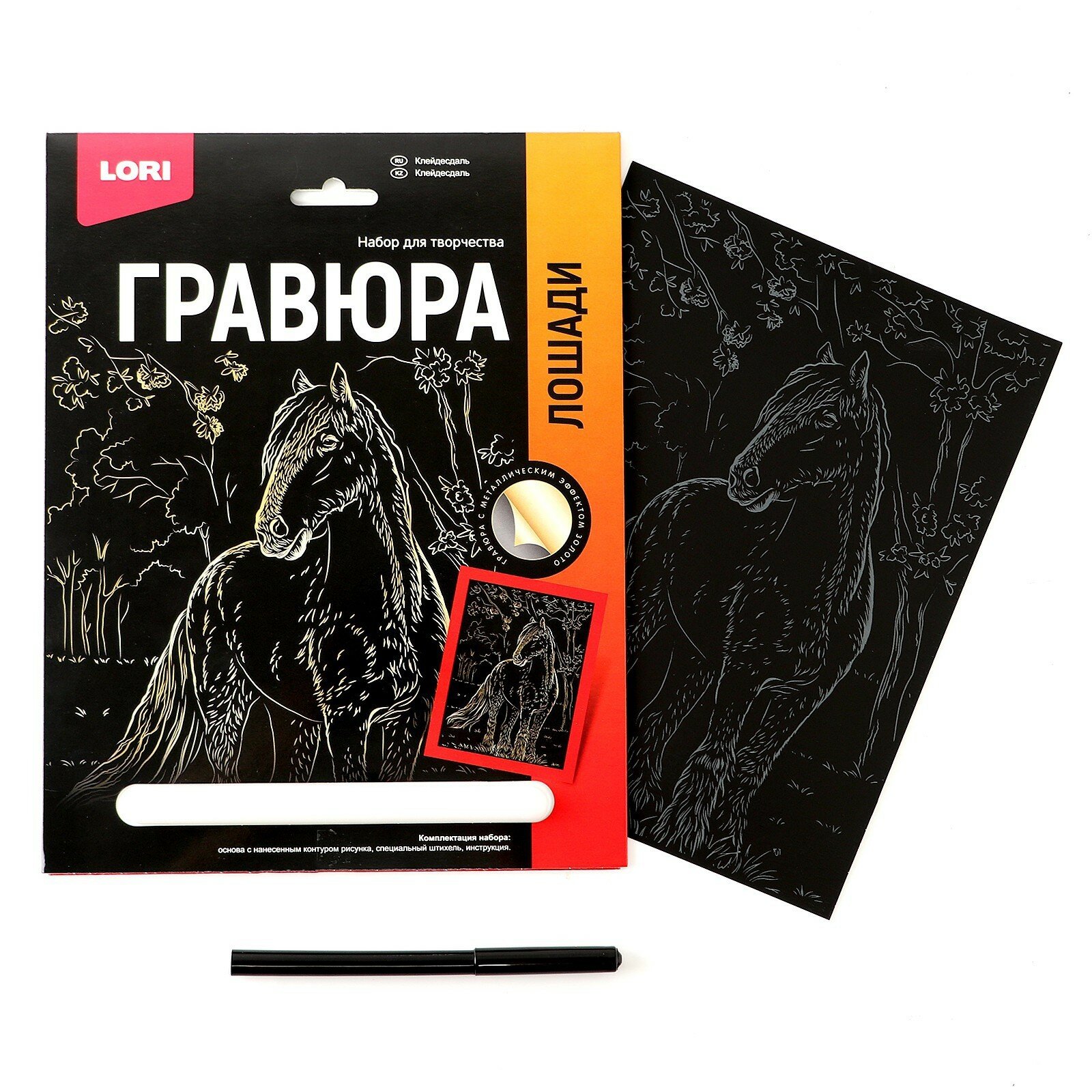 Гравюра Лошади "Клейдесдаль" с металлическим эффектом Золото, набор для детского творчества Lori, скретч картина для детей, размер 18 х 24 см интересное: