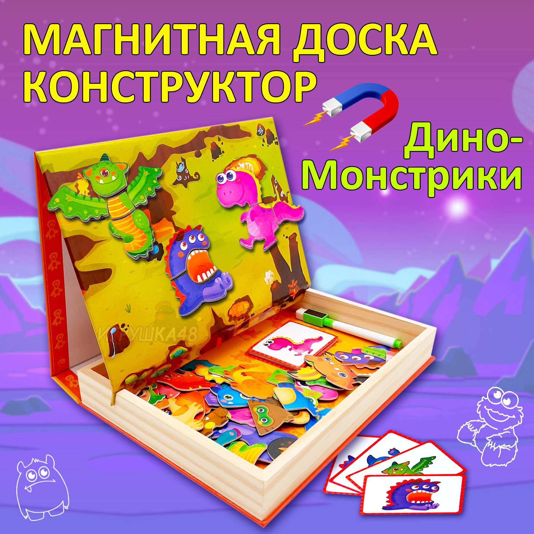 Магнитная доска "Дино-Монстрики", дерево, маркерная поверхность, 27x24x20 см интересное: