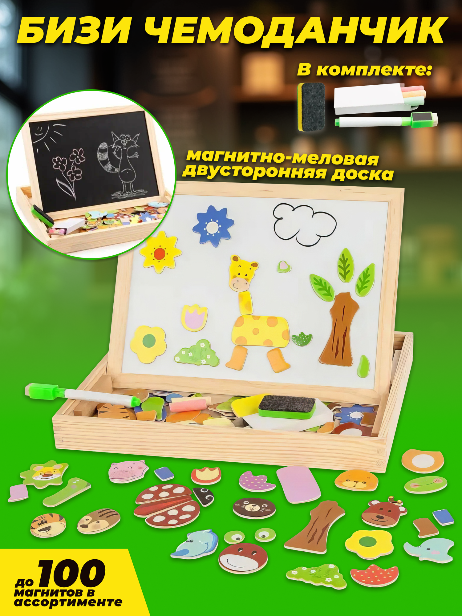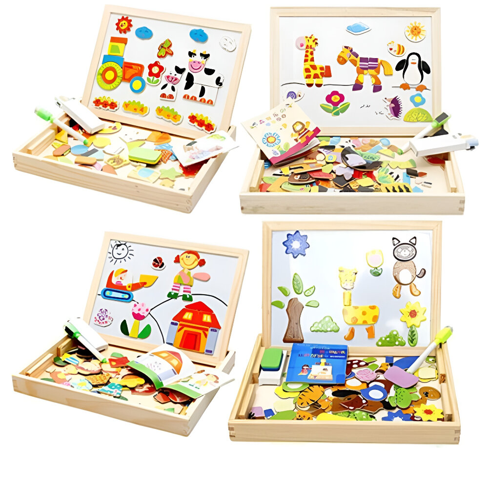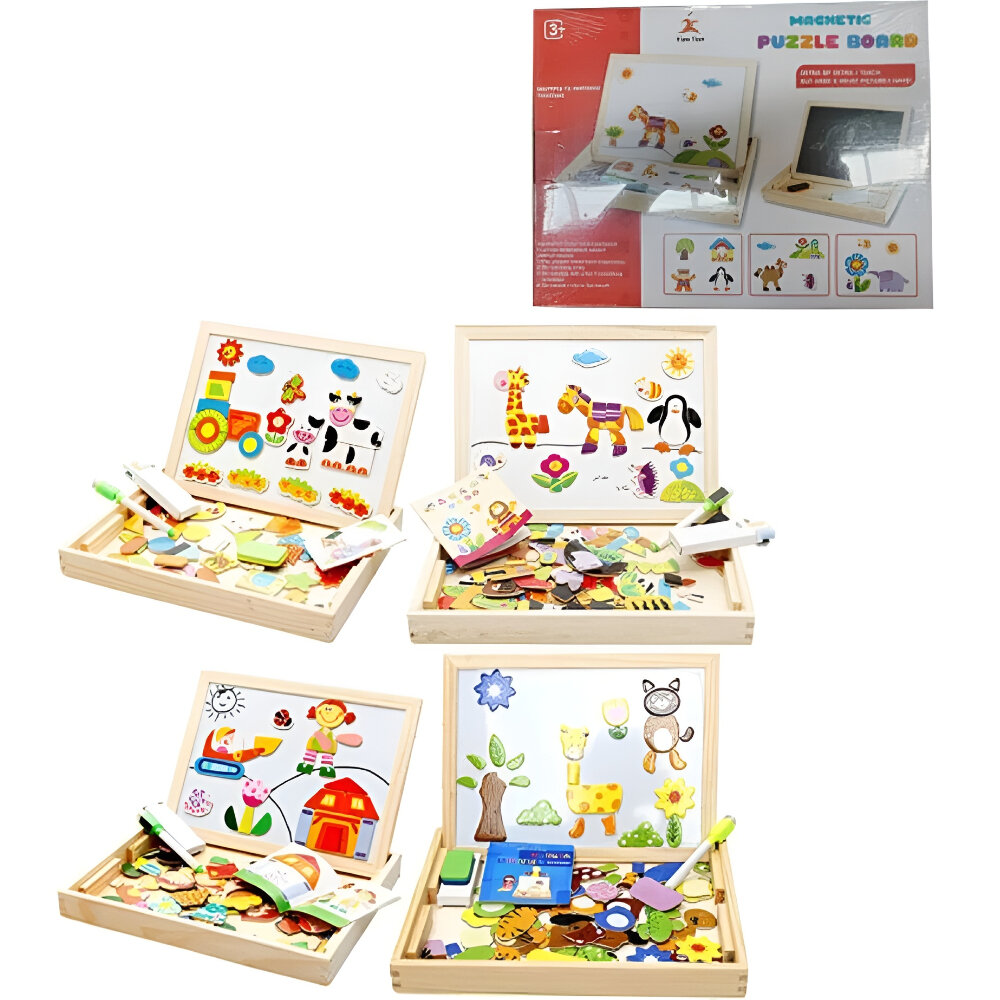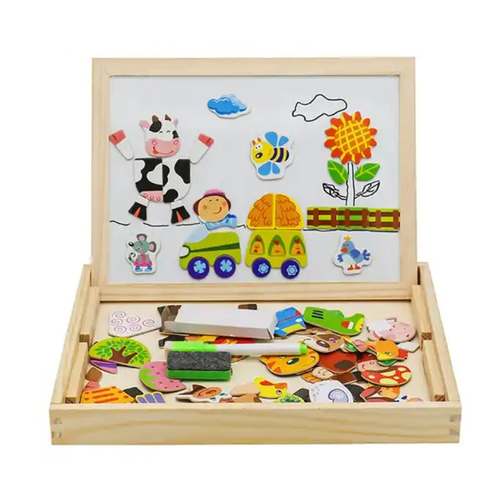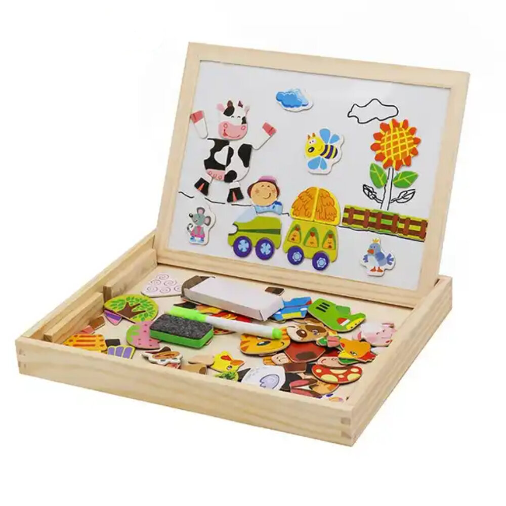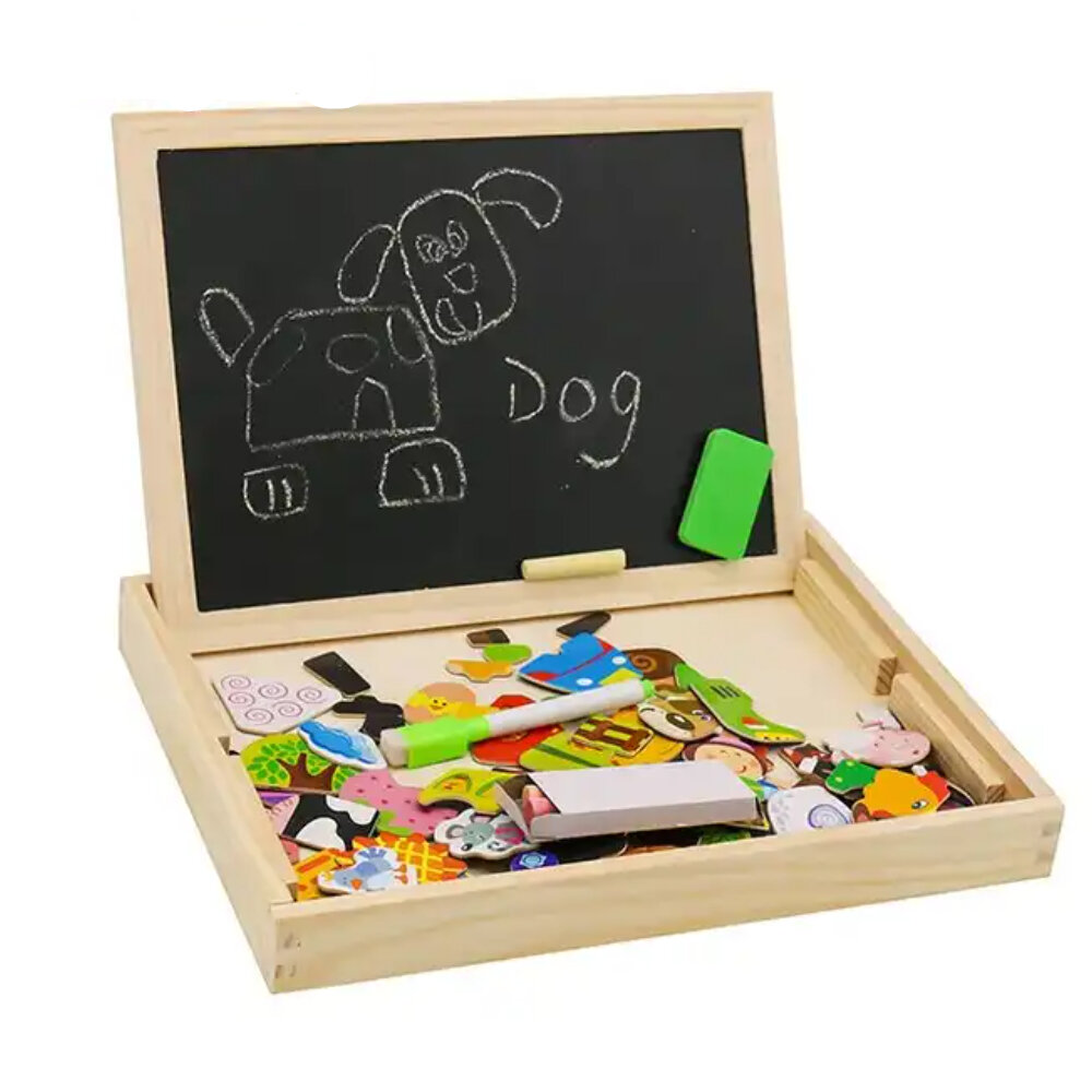Купить Детская двусторонняя доска для рисования магнитная и меловая с магнитами-пазлами, маркер, мелки, губка, коробка для хранения, 4 вида